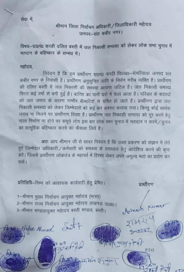 जिलाधिकारी के साथ ही मुख्य निर्वाचन आयुक्त भारत, नई दिल्ली, राज्य निर्वाचन आयुक्त उत्तर प्रदेश, लखनऊ और मण्डलायुक्त बस्ती मण्डल, बस्ती को लिखे पत्र में ग्रामीणों ने बताया है कि ग्राम पंचायत करही विकास खंड सेमरियावां जनपद संत कबीर नगर के अनुसूचित जाति के निर्धन-गरीब व्यक्ति है। हम सब की दलित बस्ती में जल निकासी की समस्या अत्यन्त जटिल है। जो विगत कई वर्षों से बनी हुई है। बारिश के मौसम में पानी घरो में चला आता है। जिससे परिवार के सदस्य जल जमाव के कारण गम्भीर बीमारियों से ग्रषित हो जाते है। हम सबने जल निकासी की समस्या को लेकर जिम्मेदारो को कई बार अवगत कराया गया। किन्तु कोई सार्थक परिणाम नही निकला।