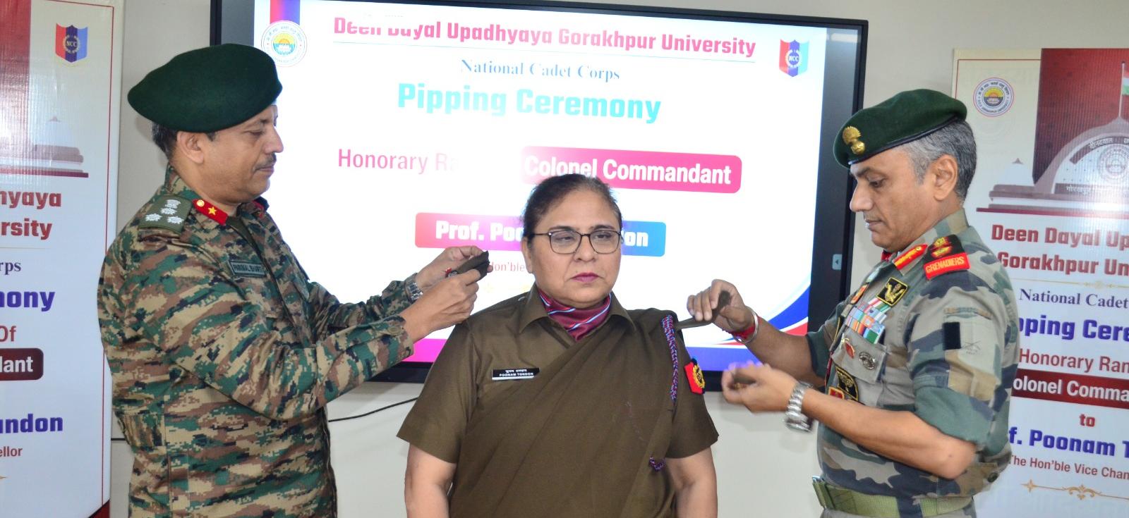 गोरखपुर (राष्ट्र की परम्परा)। दीनदयाल उपाध्याय गोरखपुर विश्वविद्यालय की कुलपति प्रो. पूनम टंडन को भारत सरकार के रक्षा मंत्रालय द्वारा ‘कर्नल कमांडेंट’ की मानद उपाधि से सम्मानित किया गया। विश्वविद्यालय परिसर में महायोगी गुरु गोरखनाथ शोधपीठ में आयोजित सम्मान समारोह के मुख्य अतिथि ब्रिगेडियर परिमल भारती, ग्रुप कमांडर, गोरखपुर ग्रुप ने यह सम्मान प्रदान किया। कर्नल कमांडेंट की मानद उपाधि से सम्मानित कुलपति प्रो. पूनम टंडन ने कहा कि यह मेरे लिए एक बहुत बड़ा सम्मान है। इस उपाधि को अपनी व्यक्तिगत उपलब्धि नहीं, बल्कि विश्वविद्यालय की सामूहिक भावना और योगदान की मान्यता के रूप में देखती हूँ। उन्होंने एनसीसी और विश्वविद्यालय के ऐतिहासिक संबंधों को रेखांकित करते हुए कहा दीनदयाल उपाध्याय गोरखपुर विश्वविद्यालय स्वतंत्रता के बाद स्थापित होने वाला पहला विश्वविद्यालय था। इसकी स्थापना 1956 में हुई थी और इसी वर्ष एनसीसी की स्थापना हुई। यह हमारे गहरे और ऐतिहासिक संबंधों को दर्शाता है। ब्रिगेडियर परिमल भारती ने कहा कि यह अत्यंत गर्व और विशेष अवसर है जिसमें हम सभी एकत्रित हुए हैं। मुझे यह कहते हुए गर्व हो रहा है कि 15 गर्ल्स बटालियन और 44 बटालियन का गोरखपुर विश्वविद्यालय से घनिष्ठ और सीधा संबंध रहा है। कुलपति महोदया ने एनसीसी को बढ़ावा देने में असाधारण योगदान दिया है। उनके नेतृत्व में एनसीसी गतिविधियों को अत्यधिक सकारात्मक प्रतिक्रिया मिली है।