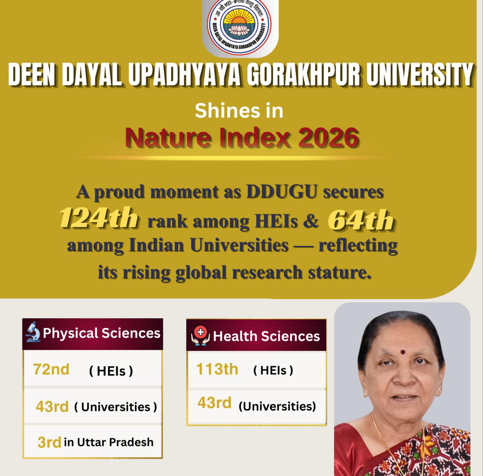 गोरखपुर (राष्ट्र की परम्परा)। दीन दयाल उपाध्याय गोरखपुर विश्वविद्यालय (डीडीयू) ने नेचर Nature Index 2026 में एक बार फिर उल्लेखनीय प्रदर्शन करते हुए अपनी मजबूत शोध क्षमता का प्रदर्शन किया है। इस उपलब्धि के साथ विश्वविद्यालय ने अंतरराष्ट्रीय स्तर पर अपनी पहचान और अधिक सुदृढ़ की है।