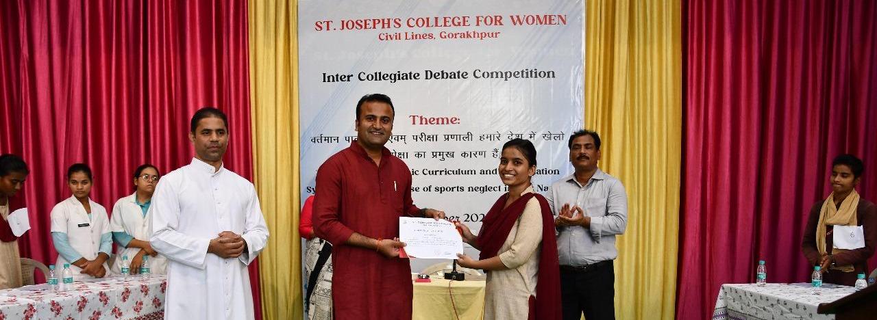 गोरखपुर (राष्ट्र की परम्परा)। सेंट जोसेफ कॉलेज फॉर वूमेन, सिविल लाइंस में एक अंतर महाविद्यालयी वाद-विवाद प्रतियोगिता का आयोजन किया गया। जिसका विषय ‘वर्तमान पाठ्यक्रम एवं परीक्षा प्रणाली: हमारे देश में खेलों की उपेक्षा का प्रमुख कारण है’ था। प्रतियोगिता में दिग्विजय नाथ पीजी कॉलेज, गंगोत्री देवी पीजी कॉलेज एवं सेंट जोसेफ कॉलेज फॉर वूमेन की छात्राओं ने बढ़-चढ़ कर प्रतिभाग किया।