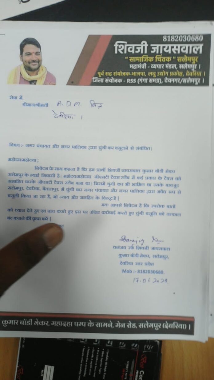 जनपद देवरिया में व्यापारियों ने चुंगी वसूली को अवैध बताते हुए इसके तत्काल बंद किए जाने की मांग उठाई है। इसी क्रम में आज व्यापारियों की ओर से धनंजय उर्फ शिव जी जायसवाल के नेतृत्व में अपर जिलाधिकारी (वित्त) एवं राज्य कर विभाग के अधिकारियों को एक ज्ञापन सौंपा गया। ज्ञापन के माध्यम से सलेमपुर, देवरिया एवं बैतालपुर क्षेत्र में हो रही चुंगी वसूली पर कड़ा विरोध दर्ज कराया गया।