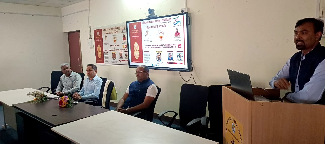 गोरखपुर (राष्ट्र की की परम्परा)। दीनदयाल उपाध्याय गोरखपुर विश्वविद्यालय के हीरक जयंती के उपलक्ष्य में कृषि एवं प्राकृतिक विज्ञान संस्थान में संवाद सत्र का आयोजन किया गया। इस सत्र में डॉक्टर अनिल कुमार पटेल, आईएफएस वन संरक्षक आगरा वृत्त आगरा एवं निदेशक इटावा सफारी पार्क, इटावा ने मुख्य वक्ता के रूप में अपने विचार साझा किए।