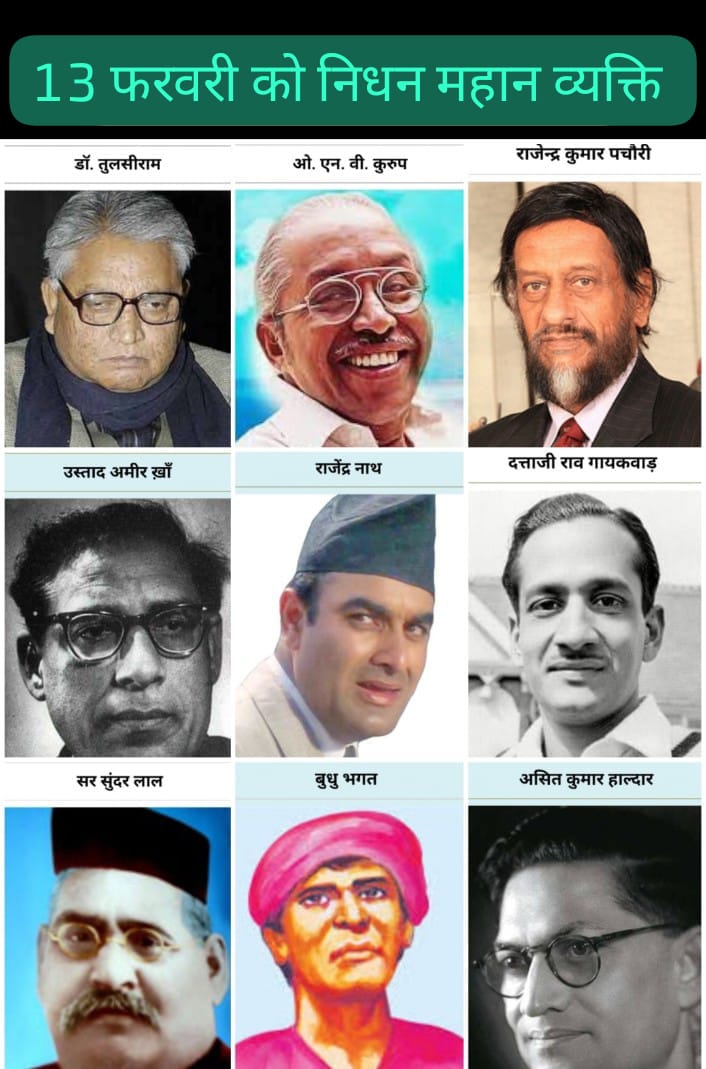 13 फरवरी को हुए निधन हमें यह याद दिलाते हैं कि समाज, संस्कृति और राष्ट्र निर्माण में इन विभूतियों का योगदान सदैव स्मरणीय रहेगा। यह दिन नई पीढ़ी को प्रेरणा लेने का अवसर भी प्रदान करता है।