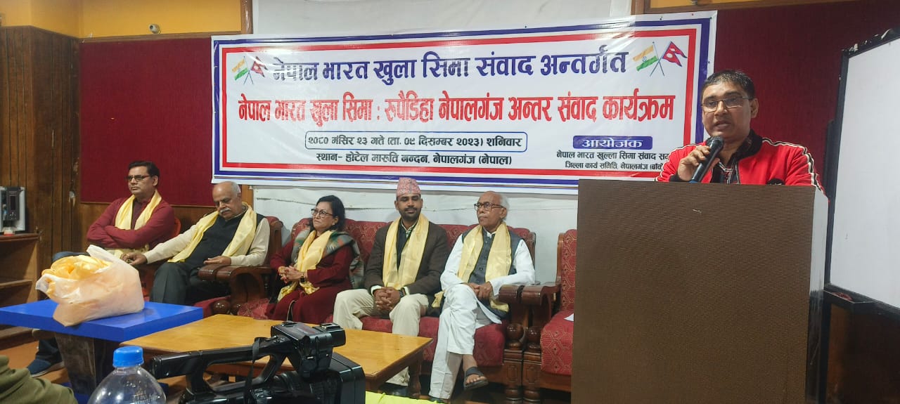 आयोजित कार्यक्रम में विनय कुमार गुप्ता के मुख्य आतिथ्य में संस्था के अध्यक्ष राजीव झा ने कार्यपत्र प्रस्तुत करते हुए सीमावर्ती समस्याओं को भारत नेपाल के पत्रकार की एक समन्वय बैठक की जिसमें राजीव झा ने कार्यक्रम की शुरुआत की और उन्होंने बताया की कोविड के दिनों में इपीजी का गठन हुआ था इसमे चार बुद्धिजीवी काठमांडू व 4 दिल्ली के सदस्य थे और उन्होंने कहा की कालान्तर में सीमा बंद करने की योजना भी हो सकती है कार्यपत्र पर समाजसेवी पशुपति दयाल मिश्र, नेपालगंज के पूर्व मेयर विजय कुमार गुप्त, लुम्बिनी प्रदेश की विधायक मीना श्रेष्ठ, पूर्व मंत्री सर्वदेव ओझा, नगर पंचायत रुपईडीहा के अध्यक्ष डॉ उमाशंकर वैश्य, भाजपा जिला कार्यकारिणी सदस्य रतन अग्रवाल, संजय वर्मा पत्रकार, शेर सिंह कसौधन ,नीरज बरनवाल, लक्ष्मी नारायण वर्मा, आशीष गुप्त, नेपालगंज आरिफ अंसारी नेपालगंज आदि लोगो ने अपने अपने विचार व्यक्त किये कार्यक्रम का संचालन प्रोफेसर मधु पौडेल ने किया।