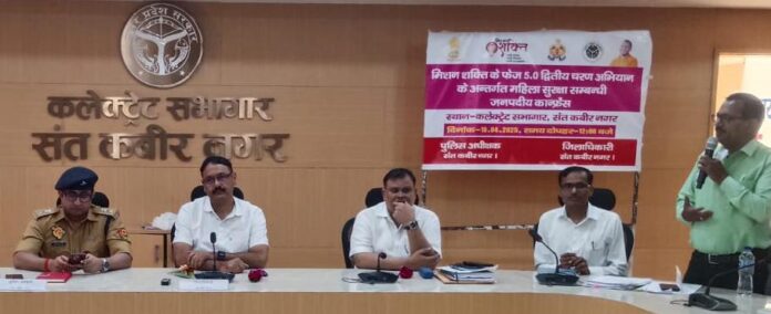 संत कबीर नगर (राष्ट्र की परम्परा)। जिलाधिकारी आलोक कुमार की अध्यक्षता में मिशन शक्ति फेज-5 के द्वितीय चरण के अंतर्गत महिला सुरक्षा विषयक जनपदीय कॉन्फ्रेंस का आयोजन कलेक्ट्रेट सभागार में किया गया। इस दौरान पुलिस अधीक्षक संदीप कुमार मीना एवं अपर जिलाधिकारी (वित्त एवं राजस्व) जयप्रकाश भी उपस्थित रहे।