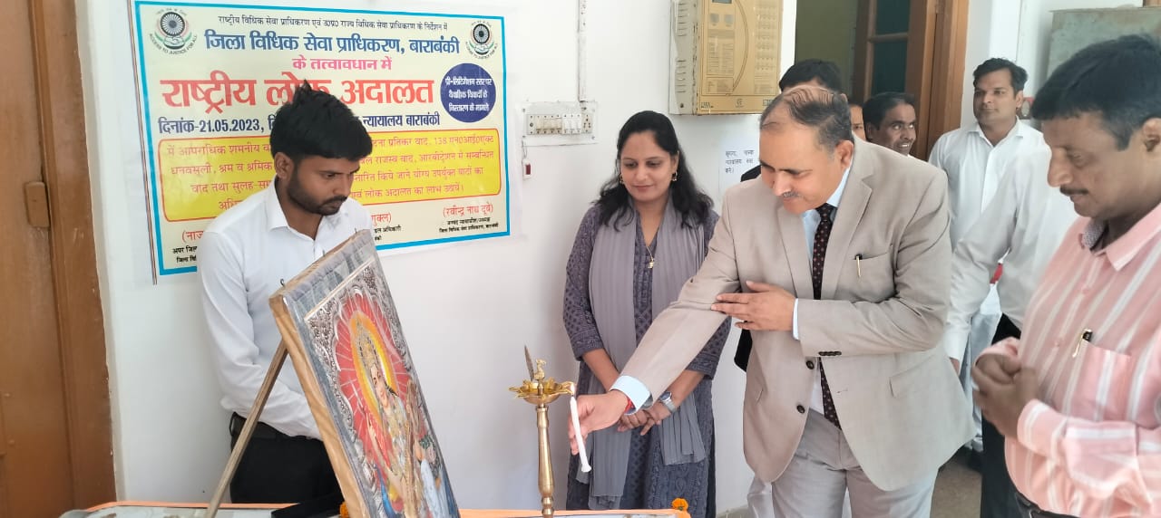 बारांबकी (राष्ट्र की परम्परा)l राज्य विधिक सेवा प्राधिकरण लखनऊ के निर्देश पर रवीन्द्र नाथ दूबे जनपद न्यायाधीश/अध्यक्ष जिला विधिक सेवा प्राधिकरण की अध्यक्षता में रविवार को राष्ट्रीय लोक अदालत का आयोजन जनपद बाराबंकी में किया गयाl राष्ट्रीय लोक अदालत का शुभारम्भ जनपद न्यायाधीश रवीन्द्र नाथ दूबे के द्वारा मां सरस्वती की प्रतिमा पर माल्यार्पण कर किया गया
