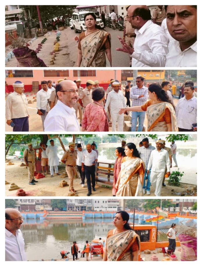 देवरिया (राष्ट्र की परम्परा)। लोक आस्था के महापर्व छठ की तैयारियों के तहत जिलाधिकारी दिव्या मित्तल ने आज शहर के विभिन्न पोखरों एवं घाटों पर स्थित छठ पूजा स्थलों की व्यवस्थाओं का विस्तृत निरीक्षण किया।निरीक्षण के दौरान उन्होंने स्वच्छता, प्रकाश व्यवस्था एवं सुरक्षा प्रबंधन को लेकर संबंधित अधिकारियों को आवश्यक दिशा-निर्देश दिए, ताकि श्रद्धालुओं को किसी प्रकार की असुविधा न हो।जिलाधिकारी ने परमार्थी पोखरा, राघव नगर स्थित हनुमान मंदिर परिसर तथा हाथीकुंड पोखरा, देवरिया खास का निरीक्षण करते हुए अधिकारियों को निर्देशित किया कि घाटों पर साफ-सफाई, प्रकाश व्यवस्था और सुरक्षा के पर्याप्त प्रबंध सुनिश्चित किए जाएं।