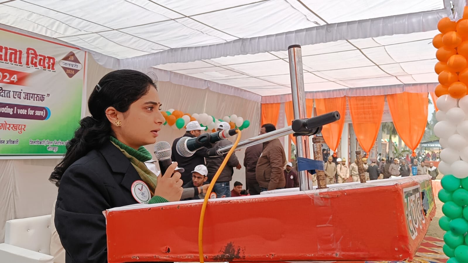 गोरखपुर(राष्ट्र की परम्परा) चौदहवे राष्ट्रीय मतदाता दिवस पर सेंट एंड्यूज डिग्री कॉलेज में सदर तहसील प्रशासन के नेतृत्व में मतदाताओं को जागरूक करने के लिए मतदाता दिवस पर जिलाधिकारी कृष्णा करुणेश ने दिलाई शपथ, नए मतदाताओं को मतदाता पहचान पत्र उत्कृष्ट कार्य करने वाले बीएलओ और सुपरवाइजर को किया सम्मानित। डीएम ने कहा कि नए मतदाताओं को अधिक से अधिक मतदाता सूची में नाम सम्मिलित करने का कार्य किया जाए और नए और व्यस्क मतदाता अपने-अपने मतदान केंद्रों पर पहुंच कर अधिक से अधिक मतदान कर सशक्त मजबूत सरकार बनाने का कार्य करें, डीएम ने कहा कि हम लोकतांत्रिक परम्पराओं की मर्यादा को बनाये रखेंगे तथा स्वतंत्र निष्पक्ष एवं शन्तिपूर्ण निर्वाचन की गरिमा को अक्षुण्ण रखते हुए निर्भीक होकर, धर्म वर्ग, जाति समुदाय, भाषा अथवा अन्य किसी भी प्रलोभन से प्रभावित हुए बिना सभी निर्वाचनों में अपने मताधिकार का प्रयोग करेंगें । डीएम ने नागरिकों से कहा की अपने राष्ट्र के चुनाव में प्रत्येक व्यक्ति का वोट ही देश के भावी भविष्य की नींव रखता है। हर एक व्यक्ति का वोट मतदान केंद्रों पर पहुंचकर अधिक से अधिक मतदान कर राष्ट्र के निर्माण में भागीदार बनना चाहिए सेंट एंड्यूज डिग्री कॉलेज में मौजूद तहसील जिला प्रशासन के कर्मचारी विभिन्न विद्यालयों से आए हुए छात्र-छात्राओं से कहा कि लोकतंत्र की प्रणाली से मिलने वाले अधिकारों में से सबसे बड़ा अधिकार मतदान का है | इसलिए सभी को मतदान के महत्व को समझना चाहिए और निष्पक्षता और पारदर्शिता के साथ निर्भीक होकर मतदान करना चाहिए और इसके लिए अन्य लोगों को भी जागरूक करना चाहिए जिससे सशक्त मजबूत सरकार बनाने में आप लोगों की भूमिका निर्णायक हो सके, यह तभी संभव है जब आप अपने मतदान केंद्रों पर पहुंच कर मतदान करेंगे और आम लोगों को जागरुक मतदान के लिए करेंगे। जिलाधिकारी कृष्णा करुणेश एलईडी बैन को हरी झंडी दिखाकर रवाना किये जो तहसीलों के गांव गांव में जाकर वोट डलवाकर डेमो दिया जाएगा जिससे वोट डालने पर किसी मतदाता को गलतफहमी ना रहे कि हमारा डाला गया वोट किसी अन्य प्रत्याशी के पक्ष में चला गया, वह वोट डालकर पूर्ण रूप से संतुष्ट होगा। इस दौरान जिलाधिकारी कृष्णा करुणेश, सीडीओ एडीएम वित्त/ उप निर्वाचन अधिकारी विनीत कुमार सिंह संजय कुमार मीना ज्वाइंट मजिस्ट्रेट/ एसडीएम सदर