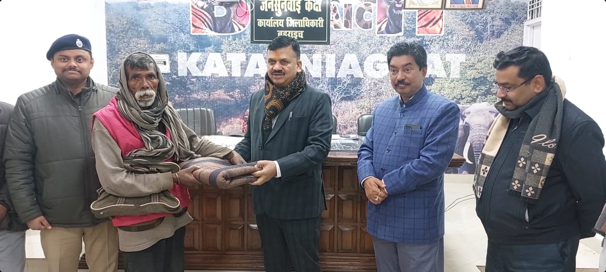 बहराइच (राष्ट्र की परम्परा)। सर्द मौसम में जिलाधिकारी के जनता दर्शन में आने वाले निर्धन, असहाय व निराश्रित 05 फरियादियों को डीएम डॉ. दिनेश चन्द्र ने पुलिस अधीक्षक प्रशान्त वर्मा के साथ कम्बल वितरण किया। विकास खण्ड रिसिया अन्तर्गत ग्राम समोखन के नियाज मोहम्मद, वि.ख. कैसरगंज के ग्राम रेवली के राम केवल व अमरिका, बहराइच नगर धनकुट्टीपुरा निवासनी बुजुर्ग महिला रामकेतकी, विकास खण्ड बलहा के ग्राम कोयलहवा निवासनी कुसुम को पहले कम्बल प्रदान किया। इसके पश्चात् जिलाधिकारी डॉ चन्द्र ने उनकी समस्याओं की सुनवाई करते हुए सम्बन्धित अधिकारियो को समयबद्धता के साथ गुणवत्तापरक निस्तारण के निर्देश दिए। इस अवसर पर पीडीडीआरडीए पी.एन. यादव, डीपीआरओ उमाकान्त पाण्डेय, डीसी मनरेगा के.डी. गोस्वामी सहित अन्य सम्बन्धित मौजूद रहे।