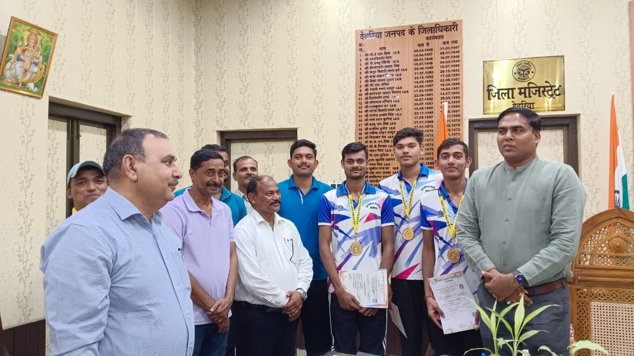 देवरिया (राष्ट्र की परम्परा)। स्कूल गेम्स फेडरेशन आफ इण्डिया राष्ट्रीय वालीबाल (u- 17 ) प्रतियोगिता में आवासीय छात्रावास वालीबाल देवरिया के तीन खिलाड़ियों के राष्ट्रीय प्रतियोगिता में स्वर्ण पदक जीतकर देवरिया आगमन पर स्वागत किया गया। जिलाधिकारी अखण्ड प्रताप सिंह एवं अपर जिलाधिकारी (प्रशासन) गौरव श्रीवास्तव द्वारा खिलाड़ियों को देवरिया आगमन पर सम्मानित किया गया।