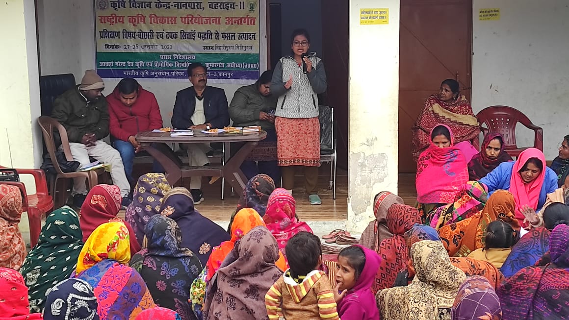 बहराइच (राष्ट्र की परम्परा)। ब्लॉक मिहींपुरवा प्रौद्योगिक विश्वविद्यालय कुमार गंज अयोध्या द्वारा संचालित कृषि विज्ञान केंद्र द्वारा गाँव बिहारीपुरवा में बौछार एवं टपक सिंचाई पद्धति से फसल उत्पादन” विषय पर प्रशिक्षण का आयोजन किया इस अवसर पर केंद्र के वरिष्ठ वैज्ञानिक एवं अध्यक्ष डॉ. के.एम. सिंह उपस्थित रहे l उन्होंने किसान भाइयों को पानी की बचत करने की सलाह दी और बताया दलहनी फसलों को बौछार विधि से सिंचाई करने से जमीन में उपस्थित ऑक्सीजन की कमी नहीं होती है एवं फसल का वृद्ध विकास भी प्रभावित नहीं होता व पानी की बचत भी होती है। केंद्र के पादप प्रजनन वैज्ञानिक डॉ अरुण कुमार ने बौछार एवं टपक सिंचाई पद्धति का परिचय दिया और इन विधियों से होने वाले लाभ, पानी की बचत करके अपनी लागत को कम कर सकते हैं। केंद्र की पौध संरक्षण वैज्ञानिक डॉ. हर्षिता ने बताया कि सब्जियों में सिंचाई टपक विधि से करनी चाहिए जिससे पानी की बचत भी होगी जड़ गलन जैसी बीमारियों का प्रकोप भी नहीं होगा और उत्पादन गुणवत्ता युक्त एवं अधिक मात्रा में मिलेगा। केंद्र की गृह वैज्ञानिक रेनू आर्या ने बताया कि पोषण वाटिका में सिंचाई बौछार विधि से करनी चाहिए, जिससे आवश्यकतानुसार पानी ही सब्जियों को मिल सके और पानी की बचत किया जा सके।