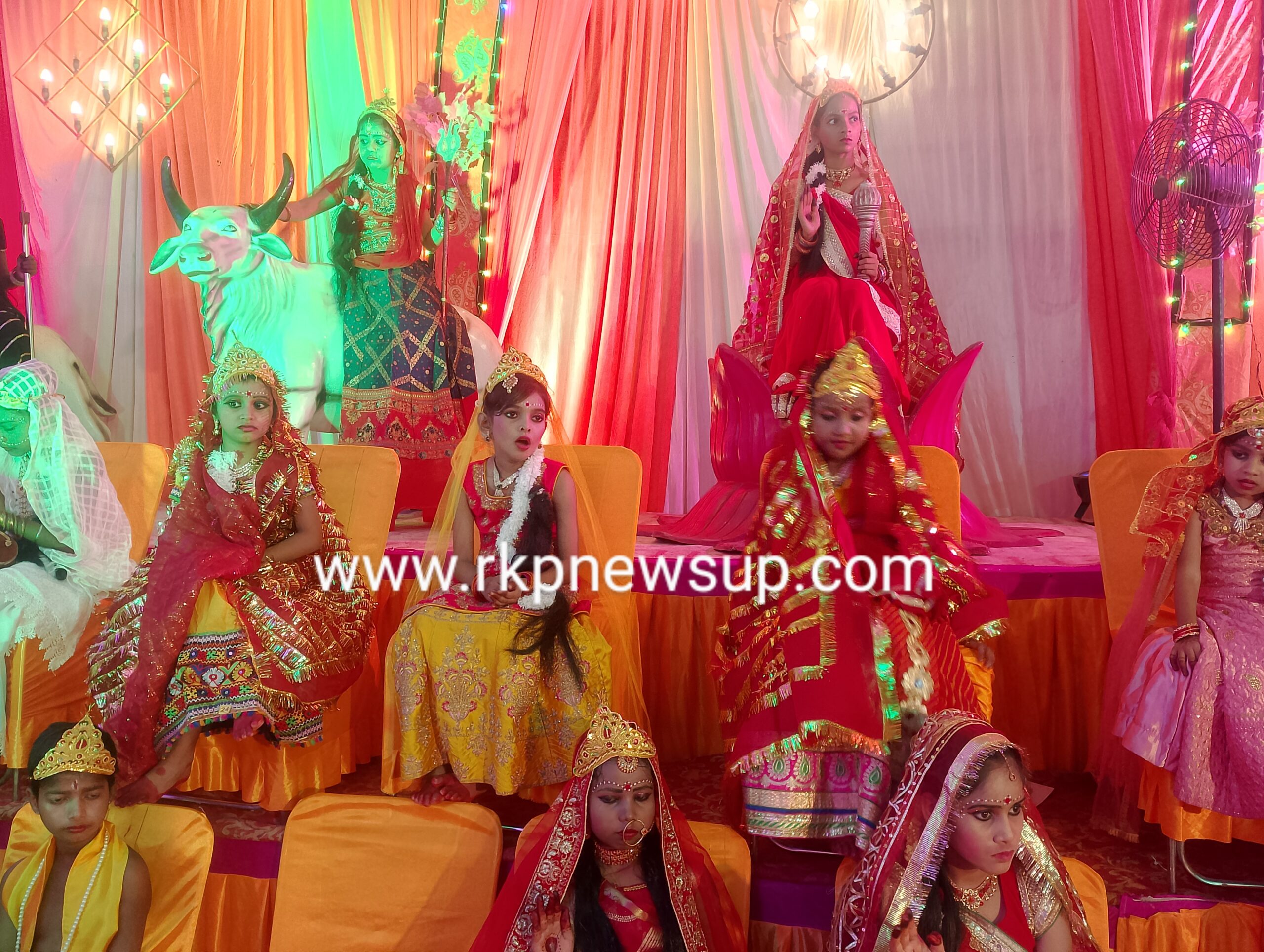 देवरिया/(राष्ट्र की परम्परा)। देवरिया जिले के देवरिया शहर में लंगड़ी देवरिया (विद्या मन्दिर स्कूल रोड) पर दशकों से हर वर्ष नवरात्रि के नौ दिनों तक 108 बालकों एवं कन्याओं द्वारा देवी, देवता व असुर का रूप धारण कर नवरात्रि के पर्व को मनमोहक बना दिया जाता है, सुदूर जिलों व पड़ोसी राज्य बिहार के सीमावर्ती जिलों से भी भारी संख्या में भक्त इन बाल रूपों को देखने के लिए हमेशा आते हैं,आज नवरात्रि के प्रथम दिन कि आकर्षक चित्र और विडियो।