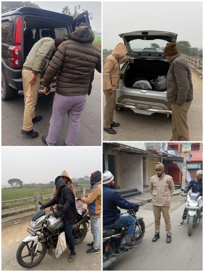 देवरिया मॉर्निंग वॉकर चेकिंग अभियान के दौरान पुलिस ने संदिग्ध व्यक्तियों और वाहनों पर कड़ी नजर रखते हुए व्यापक चेकिंग की। इस क्रम में चोरी की संदिग्ध गाड़ियों की जांच, तीन सवारी चलने वाले दोपहिया वाहनों पर कार्रवाई, मॉडिफाइड साइलेंसर वाले वाहनों का चालान, नाबालिगों द्वारा वाहन चलाने के मामलों में दंडात्मक कार्रवाई की गई। साथ ही अवैध असलहा एवं मादक पदार्थों की रोकथाम के लिए भी सघन तलाशी अभियान चलाया गया।