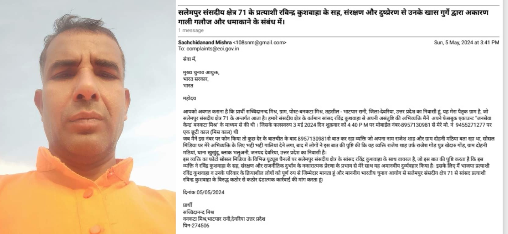 जिलाधिकारी व पुलीस अधीक्षक देवरिया, मुख्य चुनाव आयुक्त,भारत निर्वाचन आयोग,भारत सरकार, एवं संबंधित अधिकारी जन के आधिकारिक वेबसाइट पर अवगत कराते हुए समाज सेवी सच्चिदानन्द मिश्र ग्राम /पोस्ट- बनकटा मिश्र, तहसील- भाटपार रानी, देवरिया का कहना है को सलेमपुर संसदीय क्षेत्र 71 के अन्तर्गत उनका गांव आता है उनके अभिव्यक्ति की आजादी पर हमला किया गया है।