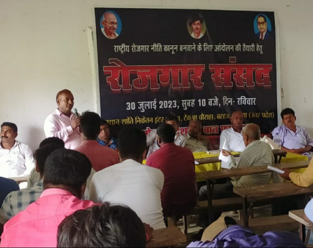 बताते चलें कि बरहज तहसील क्षेत्र ग्राम टेकुआ स्थित शांति निकेतन इंटर कॉलेज में रविवार को रोजगार संसद का आयोजन किया गया, जिसमे देश भर में 60 लाख खाली सरकारी पदों पर तुरंत भर्ती करने एवं राष्ट्रीय रोजगार नीति कानून, संसद में पास करने के मांग के साथ 19 दिसम्बर 2023 से दिल्ली में हो रहे, रोजगार आंदोलन की तैयारी हेतु नौजवान, बेरोजगार युवाओं , समाज सेवियों ने बढ़ चढ़कर हिस्सा लिया।