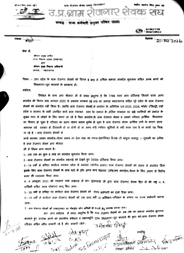 महराजगंज (राष्ट्र की परम्परा)। जिले में ग्राम रोजगार सेवकों का आक्रोश अब खुलकर सामने आ गया है। लंबे समय से आर्थिक संकट से जूझ रहे इन कर्मियों ने प्रशासन के खिलाफ मोर्चा खोलते हुए कलमबंद हड़ताल शुरू कर दी है। पिछले आठ महीनों से मानदेय और ईपीएफ भुगतान लंबित होने के कारण उनकी स्थिति लगातार बिगड़ती जा रही है। नाराज रोजगार सेवकों ने साफ शब्दों में चेतावनी दी है कि यदि उनकी मांगों पर जल्द ठोस कार्रवाई नहीं हुई तो आंदोलन को और उग्र रूप दिया जाएगा।