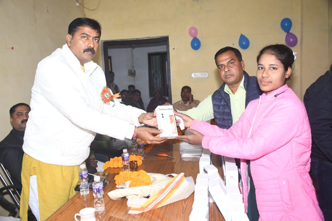 तरकुलवा/ देवरिया। (राष्ट्र की परम्परा) विकास खंड तरकुलवा अंतर्गत मुंडेरा बाबू स्थित केदार राव महिला महाविद्यालय में सोमवार को स्वामी विवेकानंद युवा सशक्तिकरण योजना के तहत छात्राओं को स्मार्ट फोन वितरण किया गया।स्मार्ट फोन पाकर छात्राओं के चेहरे खिल उठे। योजना के तहत महाविद्यालय में सत्र 2022,23 की उत्तीर्ण बीए तृतीय वर्ष की ’85 छात्राओं को मुख्य अतिथि के द्वारा स्मार्ट फोन वितरित किया गया।कार्यक्रम को संबोधित करते हुए मुख्य अतिथि भाजपा के वरिष्ठ नेता पूर्व राज्य मंत्री निरज शाही नगर पालिका अध्यक्ष कुशीनगर राकेश कुमार जायसवाल ने कहा कि विद्यार्थियों को तकनीकी रूप से समृद्ध बनाने के लिए प्रधानमंत्री और मुख्यमंत्री संकल्पित हैं।सरकार युवाओं को शिक्षा और रोजगार के लिए काफी प्रयासरत है।मोबाइल के माध्यम से छात्राएं प्रतियोगी परीक्षाओं की तैयारी आसानी से कर सकती है।विशिष्ट अतिथि पूर्व प्रमुख अभीषेक त्रिपाठी राजन ने कहा कि।स्मार्ट फोन छात्राओं के पढ़ाई में मिल का पत्थर साबित होगा।छात्राएं इसका सही उपयोग करें।