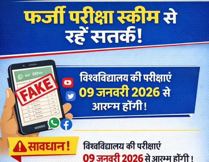 वाराणसी (राष्ट्र की परम्परा)। संपूर्णानंद संस्कृत विश्वविद्यालय के परीक्षा नियंत्रक ने हाल ही में कुछ शरारती तत्वों द्वारा सोशल मीडिया और व्हाट्सएप ग्रुप में फर्जी समय चक्र (परीक्षा स्कीम) वायरल किए जाने का संज्ञान लिया है। उन्होंने सभी को सचेत करते हुए कहा कि ऐसी अफवाहों से सावधान रहने की आवश्यकता है।