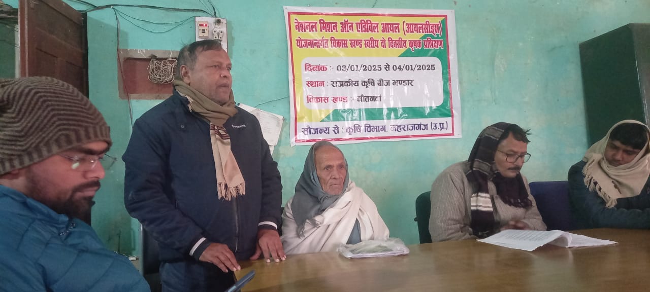 महराजगंज( राष्ट्र की परम्परा)।नौतनवां विकासखंड अंतर्गत रतनपुर स्थित राजकीय कृषि बीज भंडार कक्ष में नेशनल मिशन आन एडिविल आयल (आयलसीड) योजना अंतर्गत विकास खण्ड स्तरीय दो दिवसीय कृषक प्रशिक्षण का आयोजन किया गया। प्रशिक्षण में उपस्थित उप संभागीय कृषि प्रसार अधिकारी सुधाकर चक्रवर्ती द्वारा कृषकों को कृषि यंत्रीकरण के साथ-साथ तोरी,राई और सरसों का लाइन से बैज्ञानिक खेती के बारे में तकनीकी जानकारी दी गई। एडीओ एजी सोनू कुमार ने उपस्थित किसानों को दो दिवसीय प्रशिक्षण मे जागरूक करते हुए तिलहन दलहन आदि फसलों की जानकारी विस्तार पूर्वक दिया।