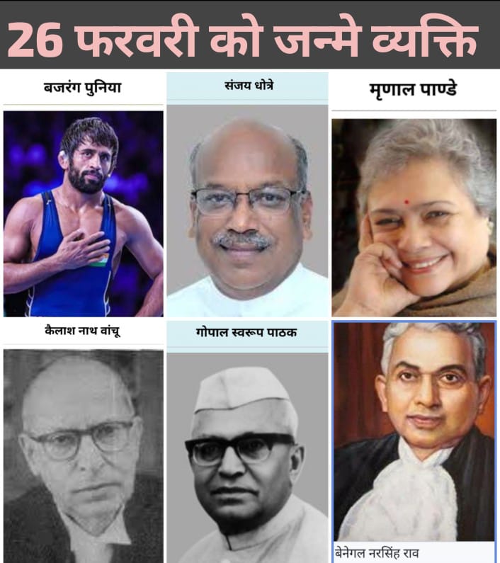 26 फ़रवरी को जन्मे व्यक्ति भारतीय इतिहास, साहित्य, न्यायपालिका, राजनीति और खेल जगत में अपनी अमिट छाप छोड़ चुके हैं। 26 फरवरी जन्मदिन वाले इन महान हस्तियों ने देश और समाज को नई दिशा दी। आइए जानते हैं 26 फरवरी इतिहास में दर्ज उन प्रमुख नामों के बारे में, जिनका जन्म आज के दिन हुआ।