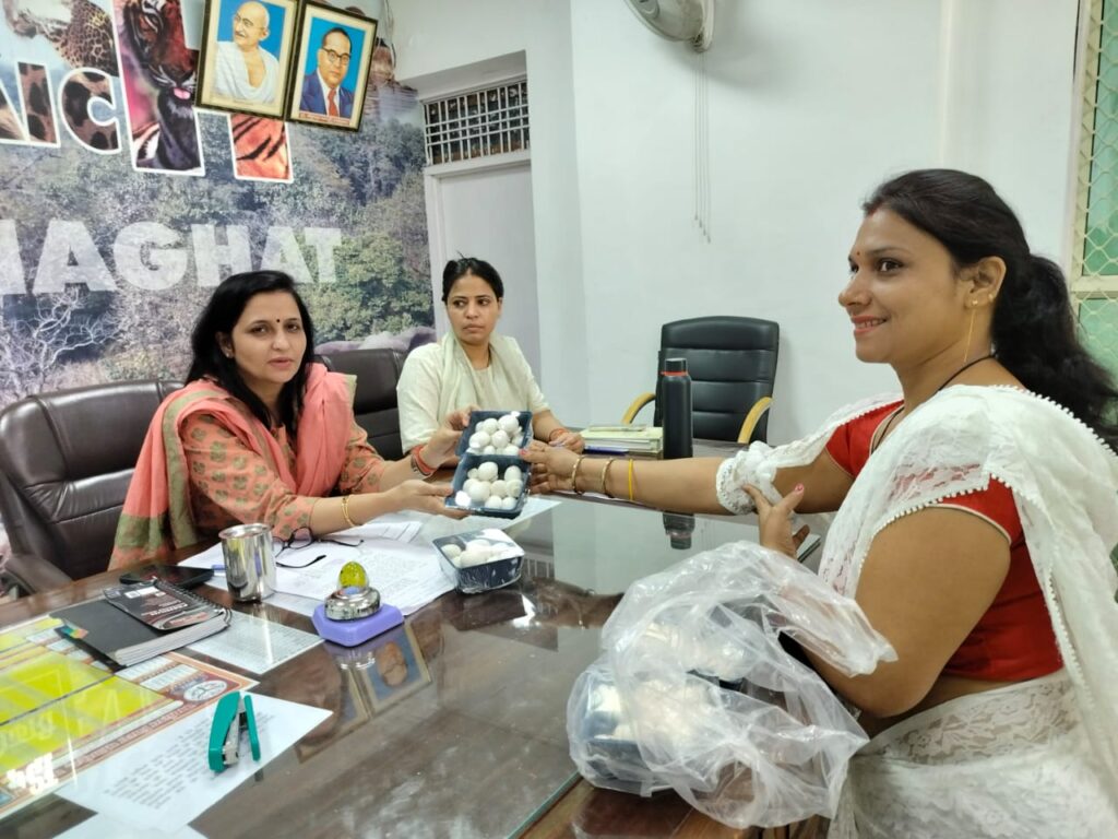 महिला कृषक ने डीएम को भेंट किये जैविक मशरूम