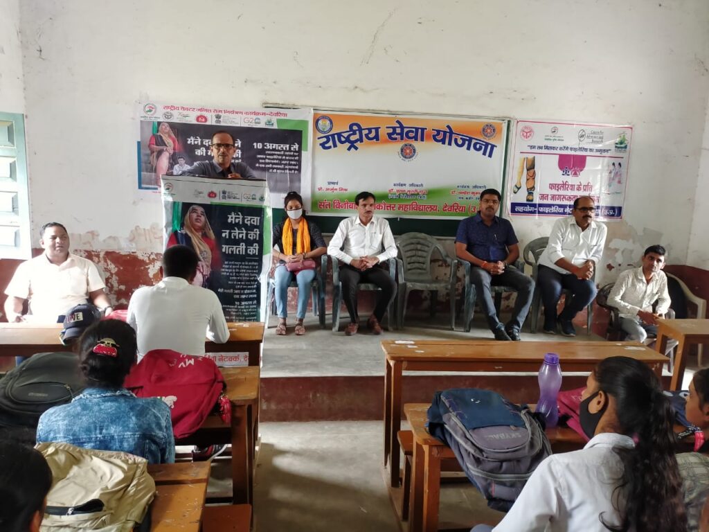 राष्ट्रीय सेवा योजना संत विनोबा पीजी कॉलेज देवरिया और स्वास्थ्य विभाग देवरिया के संयुक्त तत्वाधान में राष्ट्रीय फाइलेरिया जागरूकता प्रशिक्षण अभियान कार्यक्रम अधिकारी राष्ट्रीय सेवा योजना डाक्टर चंद्रेश कुमार बारी और डॉक्टर कृष्ण मुरारी गुप्ता द्वारा चलाया गया।