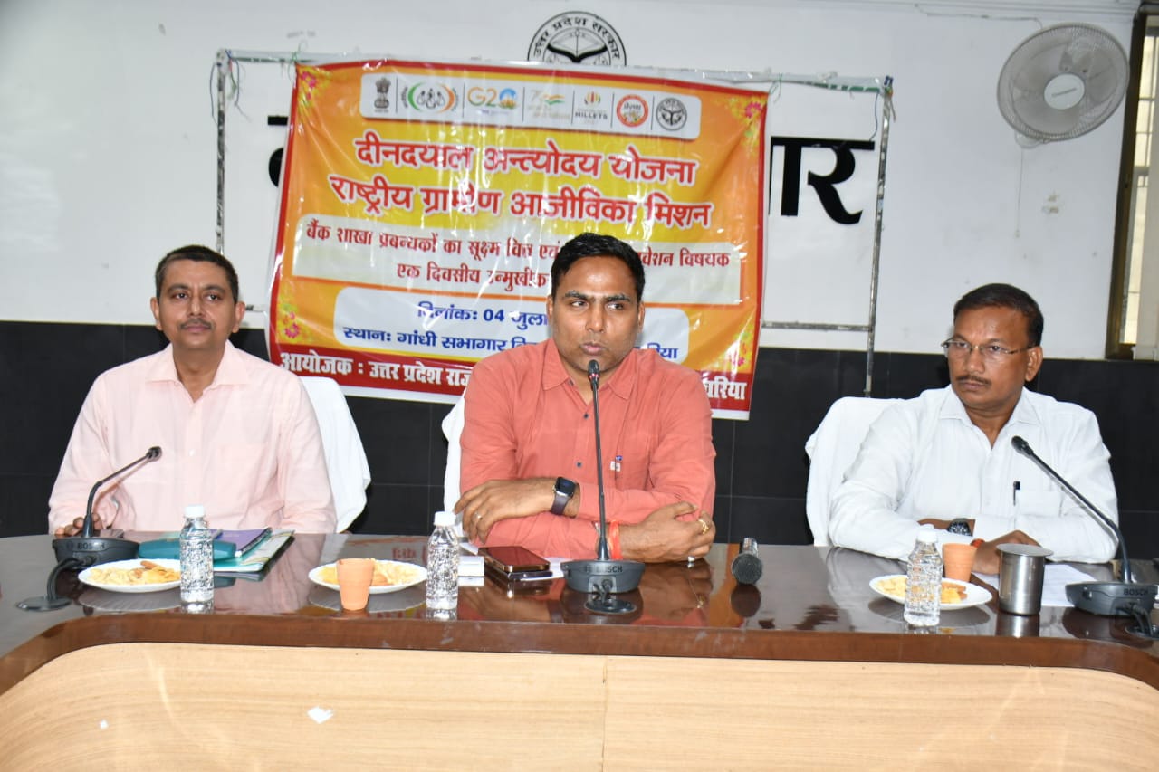 देवरिया(राष्ट्र की परम्परा)। राष्ट्रीय ग्रामीण आजीविका मिशन अन्तर्गत जनपद के ग्रामीण क्षेत्रों के बैंक शाखा प्रबन्धकों का सूक्ष्म वित्त एवं वित्तीय समावेशन विषयक एक दिवसीय उन्मुखीकरण कार्यशाला का आयोजन विकास भवन परिसर स्थित गांधी सभागार में किया गया, जिसका औपचारिक शुभारम्भ जिलाधिकारी अखण्ड प्रताप सिंह के द्वारा किया गया।