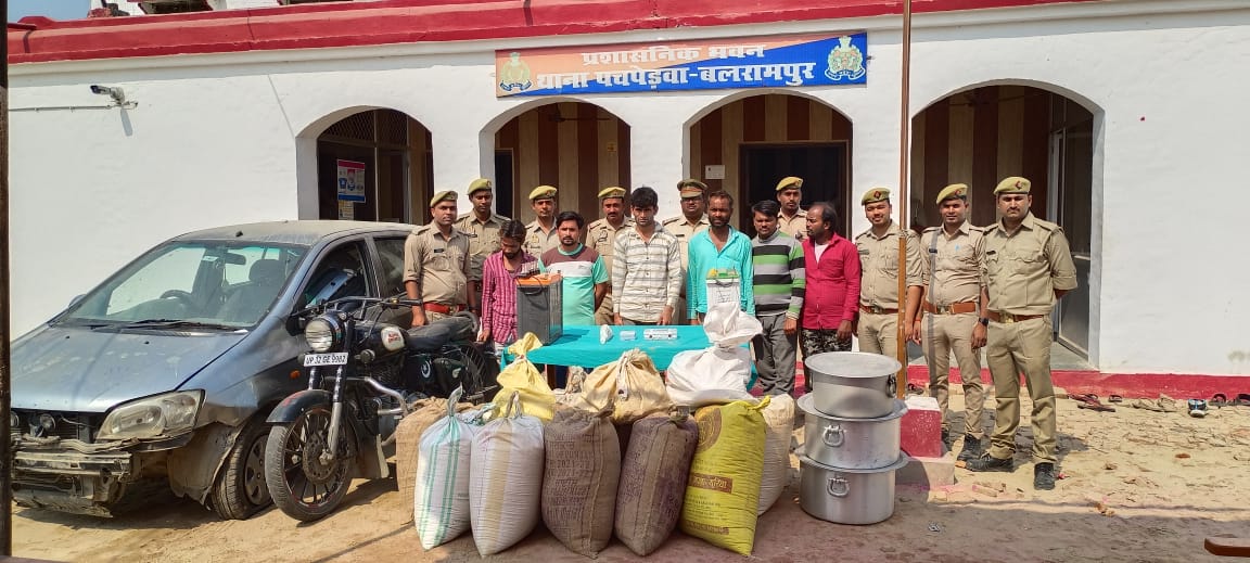 बलरामपुर (राष्ट्र की परम्परा)।पुलिस अधीक्षक केशव कुमार के निर्देशन में अपराध एवं अपराधियों के विरूद्ध चलाये जा रहे अभियान के क्रम मे अपर पुलिस अधीक्षक नम्रिता श्रीवास्तव व क्षेत्राधिकारी तुलसीपुर बलरामपुर राघवेंद्र प्रताप सिंह के पर्यवेक्षण मे व प्रभारी नि0 थाना पचपेड़वा के कुशल नेतृत्व में 11 मार्च को थाना पचपेड़वा पुलिस टीम के उ0नि0 नीरज कुमार सिंह ,उ0नि0 रमेश यादव मय पुलिस टीम द्वारा क्षेत्र भ्रमण के दौरान मुखबिर की सूचना पर पाँच शातिर चोर को चोरी किये हुए सामान के साथ भाथर रेलवे पटरी के किनारे सरजू नहर के पास से गिरफ्तार किया गया तथा चोरी के उपकरणों की निशानदेही पर फरेन्दी गाँव के पास कव्रिस्तान से 11 बोरी अनाज बरामद किया गया व चोरी का माल खरीदने वाले व्यापारी को गिरफ्तार कर उसके घर से चोरी की इन्वर्टर बैट्री बर्तन , तार , आदि समान बरामद कर तथा व्यक्तिों से उसका नाम पता पूछा गया तो अपना नाम 1.गुलाम नवी उर्फ पेऊ पुत्र पीर गुलाम निवासी फरेन्दी थाना पचपेड़वा जनपद बलरामपुर 2.सलमान पुत्र मो0 हसन नि0 ग्राम फरेन्दी थाना पचपेड़वा जनपद बलरामपुर 3.अलीहसन पुत्र मोहर्रम निवासी भोजपुर बैरिहवा थाना पचपेड़वा जनपद बलरामपुर 4.इसरार नि0ग्राम निवासी फरेन्दी थाना पचपेड़वा जनपद बलरामपुर 5. लालू उर्फ अजय प्रताप पुत्र राम प्रताप उर्फ बंशी निव फरेन्दी थाना पचपेड़वा जनपद बलरामपुर 6. जाफर अली पुत्र अकबर अली निवासी नई बाजार थाना पचपेड़वा जनपद बलरामपुर बताया गया। उपर्युक्त गिरफ्तार पांचों अभियुक्तों के विरुद्ध थाना स्थानीय पर सुसंगत धाराओं में अभियोग पंजीकृत कर अभियुक्तों को न्यायालय रवाना किया गया।