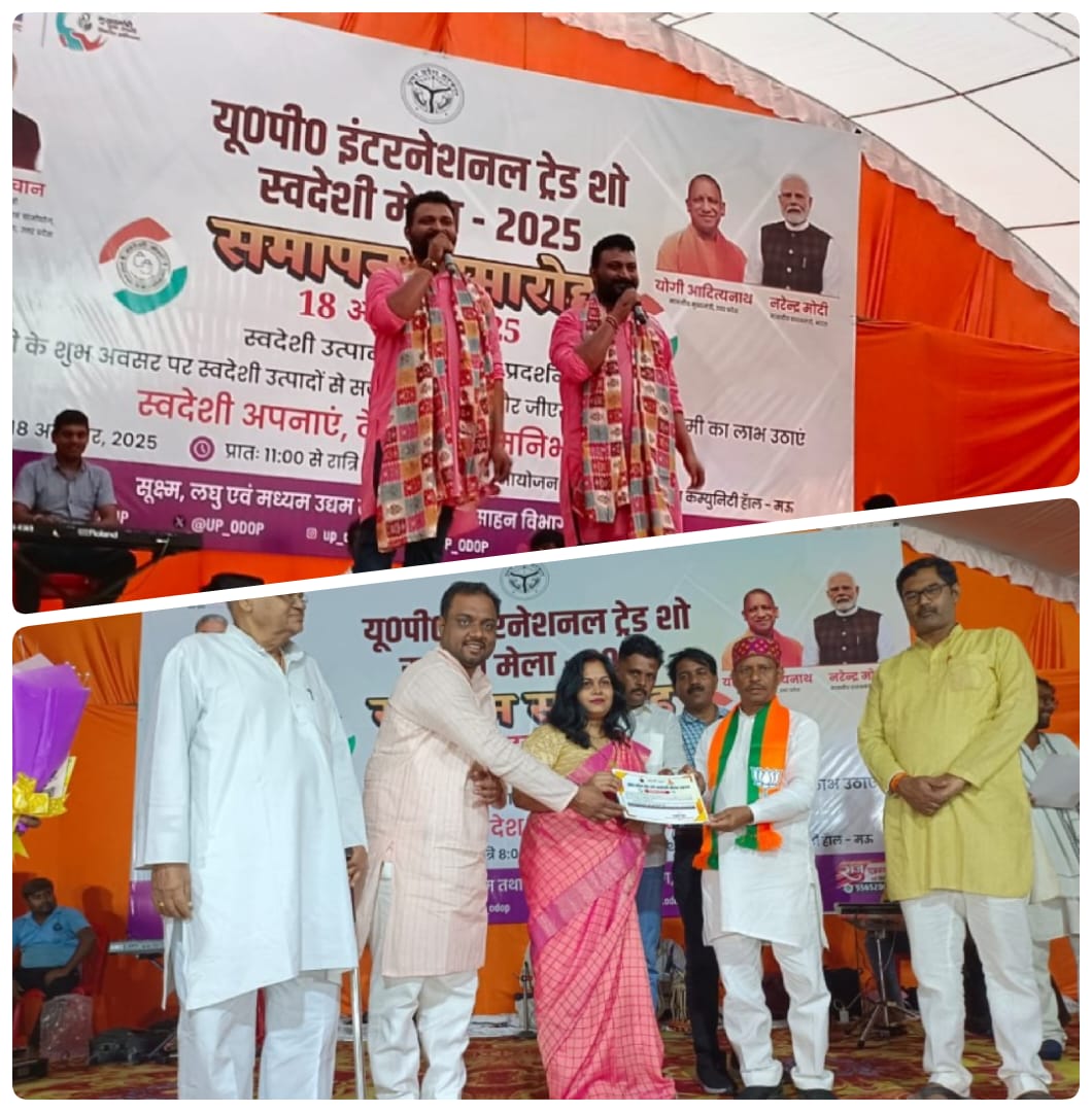 मऊ (राष्ट्र की परम्परा)। उत्साह, उमंग और संस्कृति के रंगों से सजा 10 दिवसीय स्वदेशी मेला रविवार को एक यादगार शाम के साथ संपन्न हुआ। समापन दिवस पर आयोजित भव्य सांस्कृतिक कार्यक्रम में भोजपुरी लोकगायकी के प्रसिद्ध सितारे गोपाल राय और नंदन-चंदन बंधु ने अपनी मधुर आवाज़ से श्रोताओं को मंत्रमुग्ध कर दिया। जैसे ही मंच पर दीपावली, धनतेरस और छठ महापर्व से जुड़े गीतों की गूंज उठी, पूरा परिसर तालियों और जयकारों से गूंज उठा।