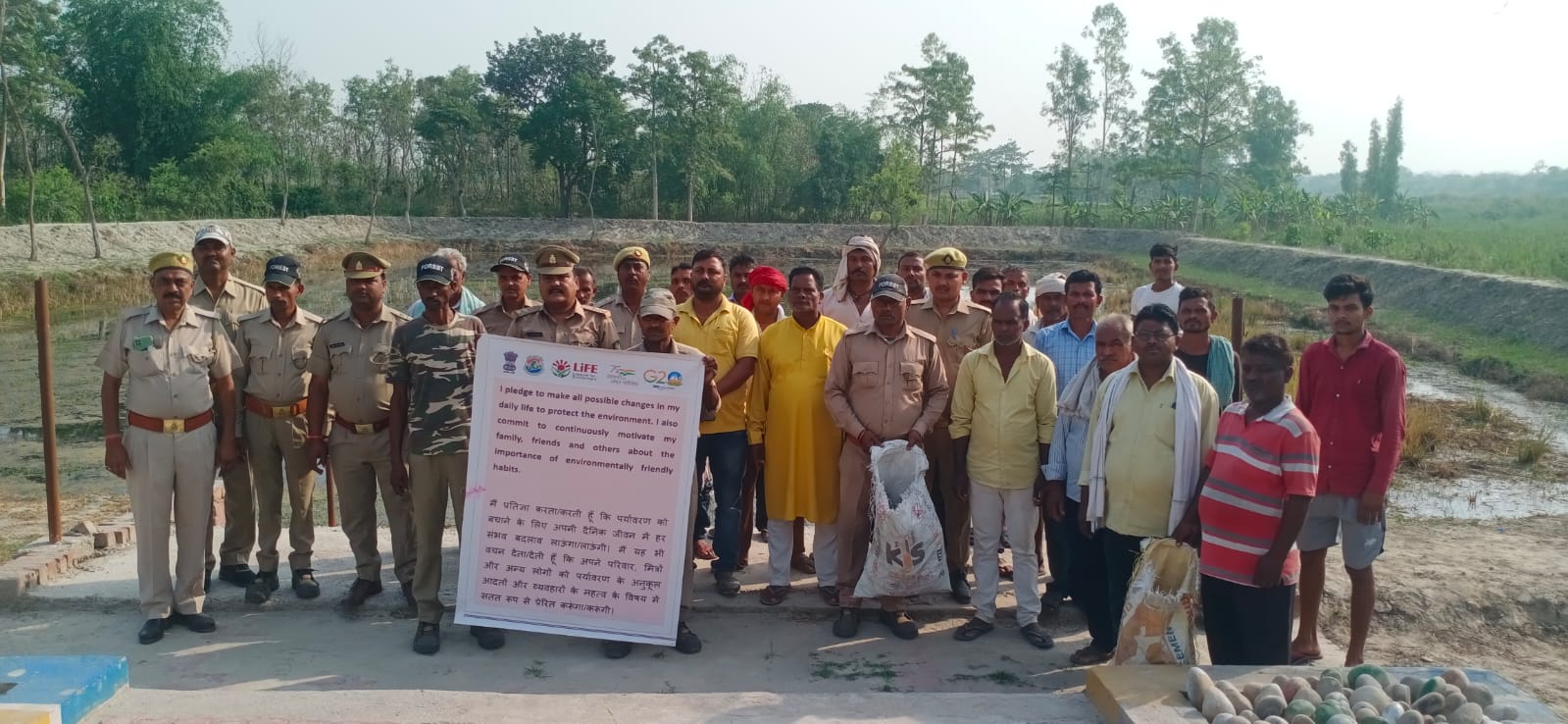 बहराइच (राष्ट्र की परम्परा) मोतीपुर डीएफओ आकाशदीप बधावन के निर्देशन तथा रेंजर रामकुमार के नेतृत्व में कतर्नियाघाट वन्यजीव प्रभाग के रेंज ककरहा के ग्राम गंगापुर में निर्मित अमृत सरोवर पर वन विभाग की ओर से मिशन लाइफ के अंतर्गत एक कार्यक्रम का आयोजन किया गया। जिसमें ग्रामीणों को पर्यावरण को स्वच्छ बनाए रखने तथा प्लास्टिक से होने वाले नुकसान के बारे में बताया गया। वन दरोगा आलोक मणि तिवारी ,राकेश कुमार, आर बी राव ,जमुना प्रसाद, ग्राम प्रधान रमेश मौर्या सहित कार्यक्रम में उपस्थित लोगों ने अमृत सरोवर के आसपास फैले प्लास्टिक के कूड़े कचरे को इकट्ठा किया तथा पर्यावरण बचाए रखने के लिए सभी ने शपथ ली।