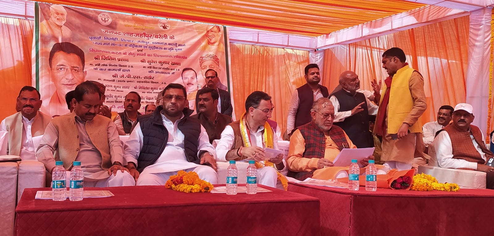 सोमवार की दोपहर जैतीपुर क्षेत्र के नवादा मोड़ में कार्यक्रम आयोजित कर तिलहर-जैतीपुर दातागंज राजमार्ग सहित करोड़ों की लागत से बनने वाली 32 परियोजनाओं का शिलान्यास एवं लोकार्पण, पीडब्ल्यूडी मंत्री जितिन प्रसाद, वित्त मंत्री सुरेश खन्ना, स्वतंत्र प्रभार मंत्री डीपीएस राठौर, क्षेत्रीय विधायक डॉ वीर विक्रम सिंह प्रिंस द्वारा बटन दबाकर किया गया।बटन दबाते हुए क्षेत्रीय जनता में खुशी की लहर दौड़ गई।इस दौरान कटरा विधायक ने कहा क्षेत्र की जनता 7 वर्षों से वनवास झेल रही थी, अब शीघ्र ही सड़क बनने से उनकी परेशानी दूर हो जाएगी। सड़क खराब होने क्षेत्र की जनता को काफी मुसीबतों को झेलना पड़ा।इसके लिए खेद है। उन्होंने पीडब्ल्यूडी मंत्री जितिन प्रसाद, वित्त मंत्री सुरेश कुमार खन्ना का स्वागत कर उनके स्केच चित्र दिए। वहीं अन्य गणमान्य व्यक्तियों को स्मृति चिन्ह भेंट कर धन्यवाद ज्ञापित किया।मंत्री जितिन प्रसाद नें कहां इस जर्जर सड़क की वजह से बदायूं बरेली आदि के लोगों ने भी काफी परेशानी झेली, अब सड़क बनने से रोजगार को बढ़ावा मिलेगा। उन्होंने मंच पर मौजूद पीडब्ल्यूडी के अधिकारियों को राजमार्ग की गुणवत्ता को लेकर सख्त निर्देश दिए।कहां सरकार की जीरो टारलेस नीति के तहत पारदर्शी तरीके से सड़क बनाएं। उन्होंने क्षेत्रीय विधायक व जनता से भी समय-समय पर सड़क की गुणवत्ता की जांच करने को कहा। वित्त मंत्री सुरेश कुमार खन्ना नें कहां, सड़क आज के समय की पहली आवश्यकता है,इससे सभी परेशानियां दूर हो सकती हैं। अच्छी सड़कें विकास के साथ-साथ रोजगार को भी बढ़ावा देती हैं। उन्होंने कार्यक्रम में मौजूद उपस्थित जनसमूह को सरकार द्वारा चलाई जा रही विभिन्न प्रकार की कल्याणकारी योजनाओं के बारे में जानकारी दी। बताया सरकार अपने वादे सबका साथ सबका विकास को साथ लेकर चल रही है। समाज के वंचित दबे कुचले लोगों का ध्यान रखा जा रहा है। सरकार सभी को मुफ्त इलाज, आवास, शौचालय आदि की सुविधाएं बगैर भेदभाव के प्रदान कर रही है।उन्होंने प्रधानों से अपील कर कहा आवास योजना में गरीब पात्र लोगों को ही लाभ दिलाएं।भेदभाव ना करे।एसडीएम से भी पात्रों की जांच करने को कहा। विधायक राजीव कुमार सिंह बब्बू भैया,फरीदपुर विधायक प्रोफ़ेसर श्याम बिहारी लाल,तिलहर विधायक सलोना कुशवाह, जलालाबाद विधायक हरि प्रकाश वर्मा, पूर्व विधायक वीरेंद्र प्रताप सिंह मुन्ना सहित आदि गणमान्य लोगों ने अपने विचार व्यक्त किए। कार्यक्रम में पूर्व केंद्रीय मंत्री एवं सांसद कृष्णा राज, एमएलसी सुधीर गुप्ता,भाजपा जिला अध्यक्ष केसी मिश्रा, प्रगतिशील किसान कौशल मिश्रा,जिला पंचायत सदस्य रूम सिंह यादव,जैतीपुर ब्लाक प्रमुख पति राजीव कश्यप,कटरा खुदागंज ब्लॉ