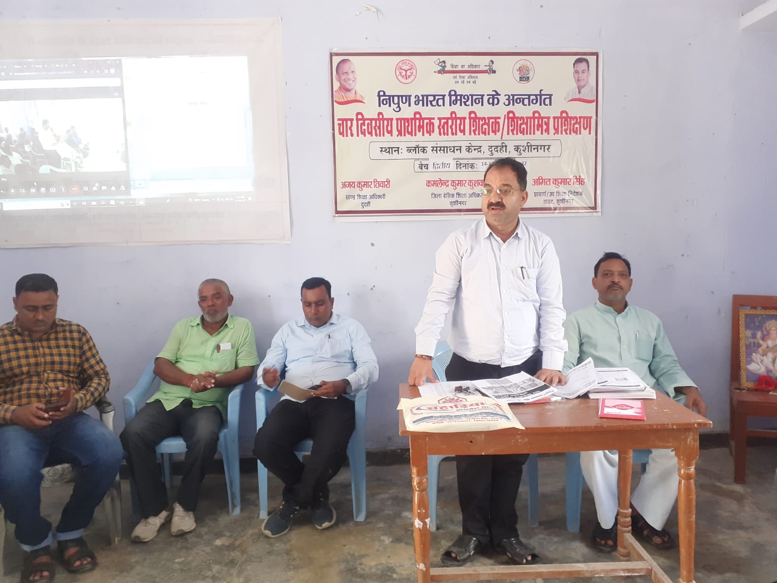 यह बातें बीईओ अजय कुमार तिवारी ने कही। वह शुक्रवार को बीआरसी सभागार में आयोजित निपुण भारत मिशन योजना के अंतर्गत चार दिवसीय प्राथमिक स्तरीय शिक्षक / शिक्षा मित्र प्रशिक्षण के प्रथम व द्वितीय बैच के उद्घाटन सत्र को संबोधित कर रहे थे। बीईओ ने आगामी दिसंबर तक शिक्षकों को लक्ष्य प्राप्ति के लिए प्रेरित करते हुए कहा कि यह प्रशिक्षण बच्चों के अधिगम स्तर के विकास के लिए बहुत कारगर साबित होगी।