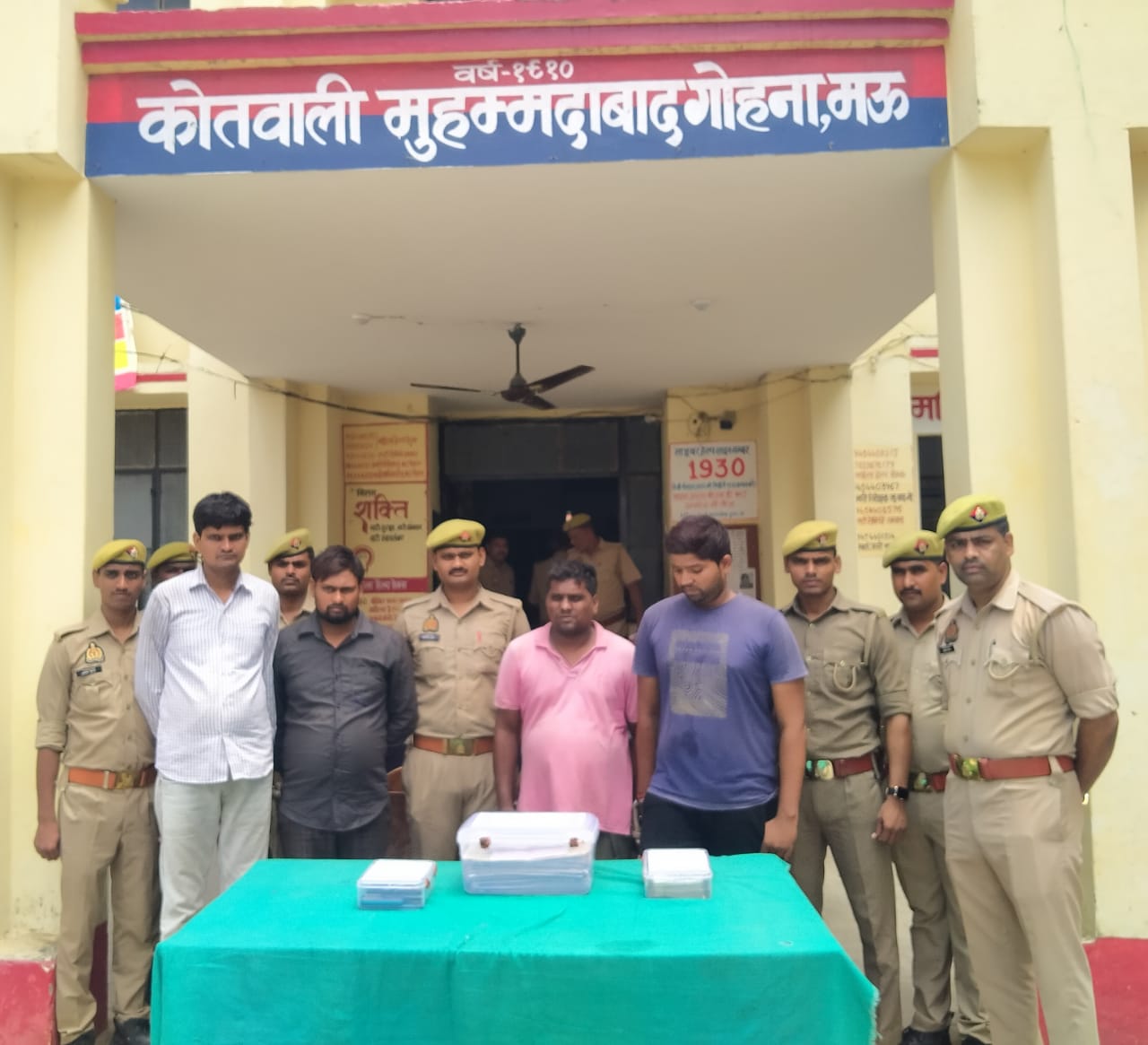 मुहम्मदाबाद गोहना कोतवाली क्षेत्र के भैसहा मोड़ के पास से पुलिस ने 4 अभियुक्तों को गिरफ्तार कर जेल भेजा है। पुलिस अधीक्षक मऊ अविनाश पाण्डेय के आदेशानुसार पुलिस उपाधीक्षक मुहम्मदाबाद गोहना डॉ अजय विक्रम सिंह के निर्देशन में अपराध व अपराधियों की गिरफ्तारी हेतु चलाए जा रहे अभियान के क्रम में पुलिस को बड़ी सफलता प्राप्त हुई है। बुधवार को कोतवाली परिसर मे पुलिस अधीक्षक ने प्रेस वार्ता करते बताया कि बुधवार को पेपर साल्वभर गैंग के इस बड़े रैकेट को पकड़ा गया है, मुखबिर की सूचना पर मोहम्दाबाद गोहना-करहां मुख्य मार्ग पर स्थित भैसहा मोड़ के पास इन चारों लोगों को पकड़ा गया।
