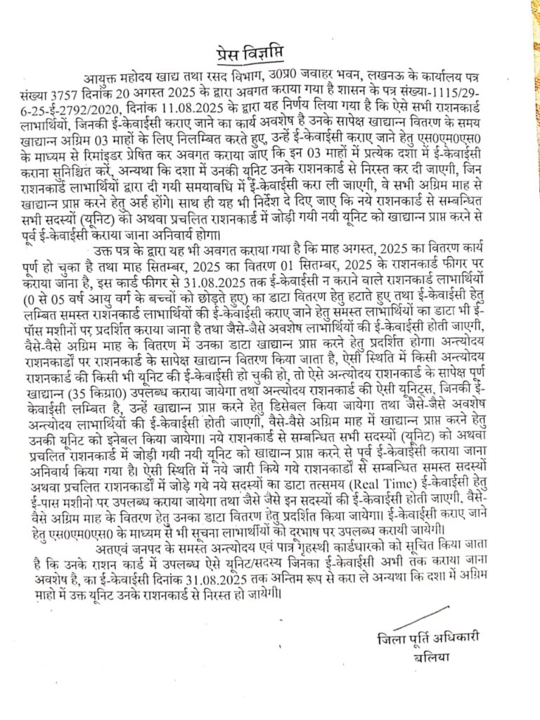 बलिया (राष्ट्र की परम्परा)। जिले के अंत्योदय एवं पात्र गृहस्थी राशन कार्ड धारकों के लिए बड़ा अलर्ट! जिला पूर्ति अधिकारी ने जानकारी दी है कि जिन कार्डधारकों के राशन कार्ड में दर्ज किसी भी सदस्य का ई-केवाईसी अब तक नहीं हुआ है, वे 31 अगस्त तक इसे हर हाल में पूरा करा लें। चेतावनी देते हुए अधिकारी ने कहा कि समय सीमा के बाद जिन यूनिट/सदस्यों का ई-केवाईसी अधूरा रह जाएगा, उनका नाम राशन कार्ड से स्वतः निरस्त कर दिया जाएगा और वे मुफ्त अनाज का लाभ नहीं ले पाएंगे। यानी यदि परिवार को सरकारी अनाज योजना का लाभ लेना है, तो ई-केवाईसी कराना अब अनिवार्य है।