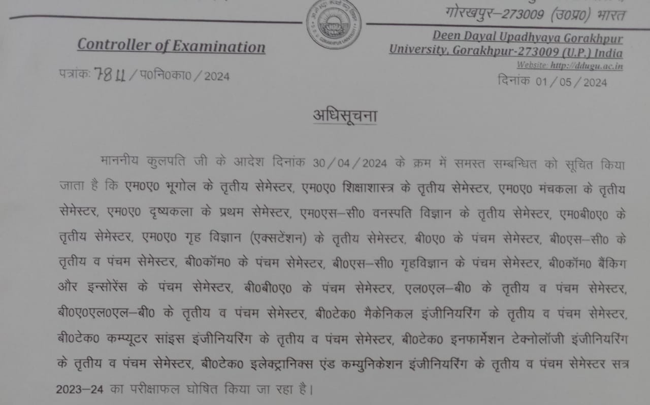 गोरखपुर (राष्ट्र की परम्परा)। दीनदयाल उपाध्याय गोरखपुर विश्वविद्यालय की कुलपति प्रो. पूनम टंडन के आदेश के क्रम में एम०ए० भूगोल के तृतीय सेमेस्टर, एम०ए० शिक्षाशास्त्र के तृतीय सेमेस्टर, एम०ए० मंचकला के तृतीय सेमेस्टर, एम०ए० दृष्यकला के प्रथम सेमेस्टर, एम०एस-सी० वनस्पति विज्ञान के तृतीय सेमेस्टर, एम०बी०ए० के तृतीय सेमेस्टर, एम०ए० गृह विज्ञान (एक्सटेंशन) के तृतीय सेमेस्टर, बी०ए० के पंचम सेमेस्टर, बी०एस-सी० के तृतीय व पंचम सेमेस्टर, बी०कॉम० के पंचम सेमेस्टर, बी०एस-सी० गृहविज्ञान के पंचम सेमेस्टर, बी०कॉम० बैंकिग और इन्सोरेंस के पंचम सेमेस्टर, बी०बी०ए० के पंचम सेमेस्टर, एल०एल-बी० के तृतीय व पंचम सेमेस्टर, बी०ए०एल०एल-बी० के तृतीय व पंचम सेमेस्टर, बी०टेक० मैकेनिकल इंजीनियरिंग के तृतीय व पंचम सेमेस्टर, बी०टेक० कम्प्यूटर सांइस इंजीनियरिंग के तृतीय व पंचम सेमेस्टर, बी०टेक० इनफार्मेशन टेक्नोलॉजी इंजीनियरिंग के तृतीय व पंचम सेमेस्टर, बी०टेक० इलेक्ट्रानिक्स एंड कम्युनिकेशन इंजीनियरिंग के तृतीय व पंचम सेमेस्टर सत्र 2023-24 का परीक्षाफल बुधवार को घोषित किया गया।