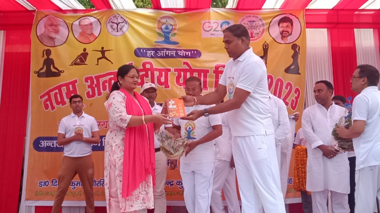 नवम् अंतरराष्ट्रीय योग दिवस के अवसर पर आज रविंद्र किशोर शाही स्पोर्ट्स स्टेडियम में जनपद स्तरीय योगाभ्यास कार्यक्रम का भव्य आयोजन हुआ। कार्यक्रम में मुख्य अतिथि माननीय कृषि मंत्री सूर्य प्रताप शाही, राज्यमंत्री ग्राम्य विकास विभाग विजय लक्ष्मी गौतम, सांसद डॉ रामापति राम त्रिपाठी, जिलाधिकारी अखंड प्रताप सिंह सहित विभिन्न जन प्रतिनिधियों, अधिकारियों एवं प्रबुद्धजनों ने योगाभ्यास किया।इस अवसर पर कृषि मंत्री सूर्य प्रताप शाही ने कहा कि योग हमारी सांस्कृतिक विरासत की अनमोल धरोहर है। योग सिर्फ एक क्रिया मात्र नहीं है बल्कि यह जीवन पद्धति है। उन्होंने कहा कि प्रधानमंत्री जी की विशेष पहल पर योग को वैश्विक पहचान मिली और आज पूरी दुनिया योग का लाभ उठा रही है। ग्राम्य विकास राज्यमंत्री विजय लक्ष्मी गौतम ने निरोग रहने के लिए प्रतिदिन योग करने की अपील करते हुए कहा कि नियमित योग करने से अच्छे स्वास्थ्य के साथ मनोबल भी मजबूत होता है। उन्होंने योग को लोकप्रिय बनाने के लिए केंद्र एवं प्रदेश सरकार द्वारा किए जा रहे प्रयासों का उल्लेख भी किया।