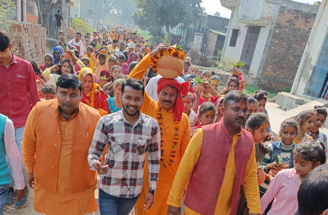 संत कबीर नगर(राष्ट्र की परम्परा)। जिले के विकास खण्ड खलीलाबाद के ग्राम पंचायत बयारा के समय माता चौखड़िया धाम में आयोजित सप्त दिवसीय श्रीमद्भागवत कथा के प्रथम दिवस यज्ञाचार्य, कथा व्यास आचार्य पंडित कंचन शुक्ल के मार्गदर्शन व सानिध्य में विधि-विधान से वेदी पूजन के पश्चात भव्य मंगल कलश यात्रा निकाली। जिसमें पीतांबरधारी महिलाएं कलश सिर पर धारण कर प्रभु का गुणगान करते हुए बयारा गांव के मुख्य मार्गों से होते हुए ग्राम रसूलपुर के समस्त मंदिरों में पूजा-अर्चन करते हुए रसूलपुर रेलवे क्रॉसिंग, मिडिल स्कूल होते हुए नगर पंचायत मगहर के मुख्य मार्ग से चल कर आमी नदी से कलश में जल भरने बाद पुन: मगहर से इस्लामनगर, मोहम्मदपुर काठर व अशरफाबाद होते कार्यक्रम स्थल पहुंच कलश यात्रा समाप्त हुई।