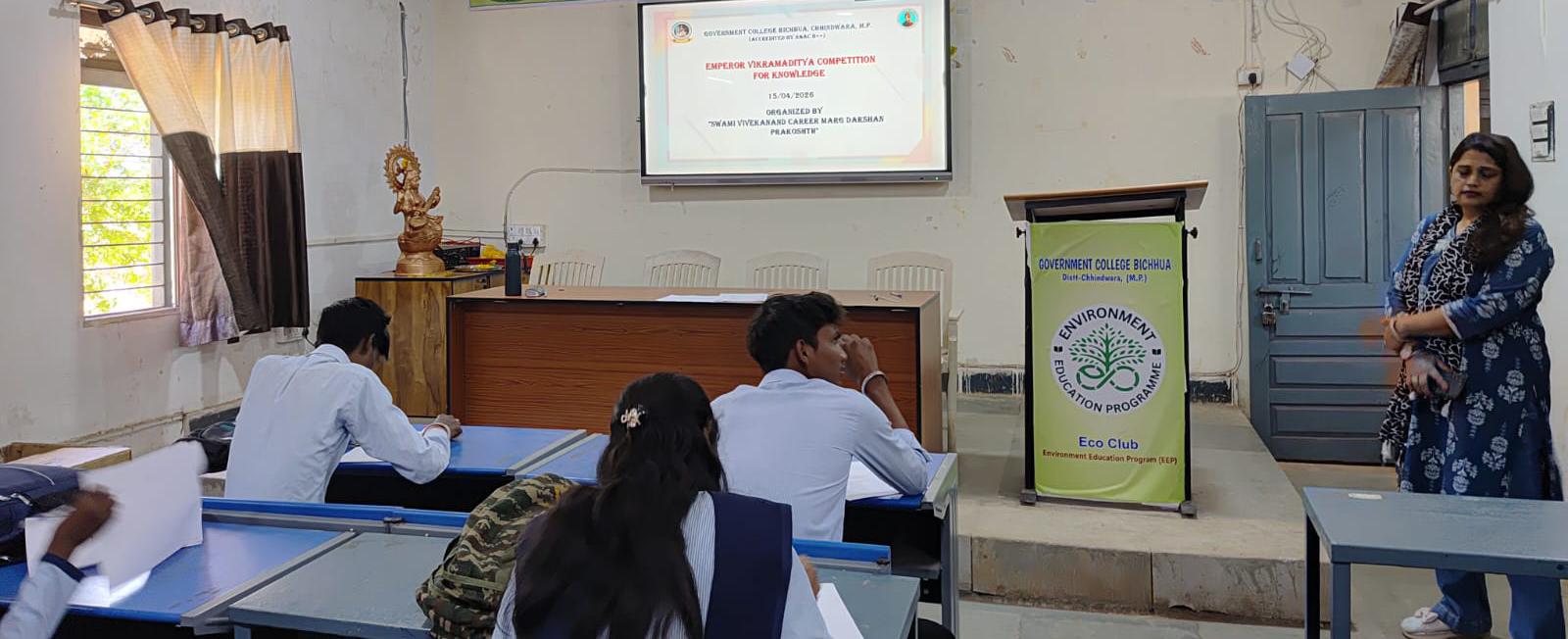 बिछुआ/मप्र (राष्ट्र की परम्परा)। शासकीय महाविद्यालय बिछुआ में स्वामी विवेकानंद करिअर मार्गदर्शन प्रकोष्ठ के तत्वावधान में बुधवार को टैगोर हॉल में “सामर्थ विक्रमादित्य ज्ञान प्रतियोगिता” का भव्य आयोजन किया गया। यह प्रतियोगिता महाविद्यालय के प्राचार्य डॉ. आर. पी. यादव के निर्देशन तथा वरिष्ठ प्राध्यापक डॉ. पूजा तिवारी के मार्गदर्शन में संपन्न हुई।