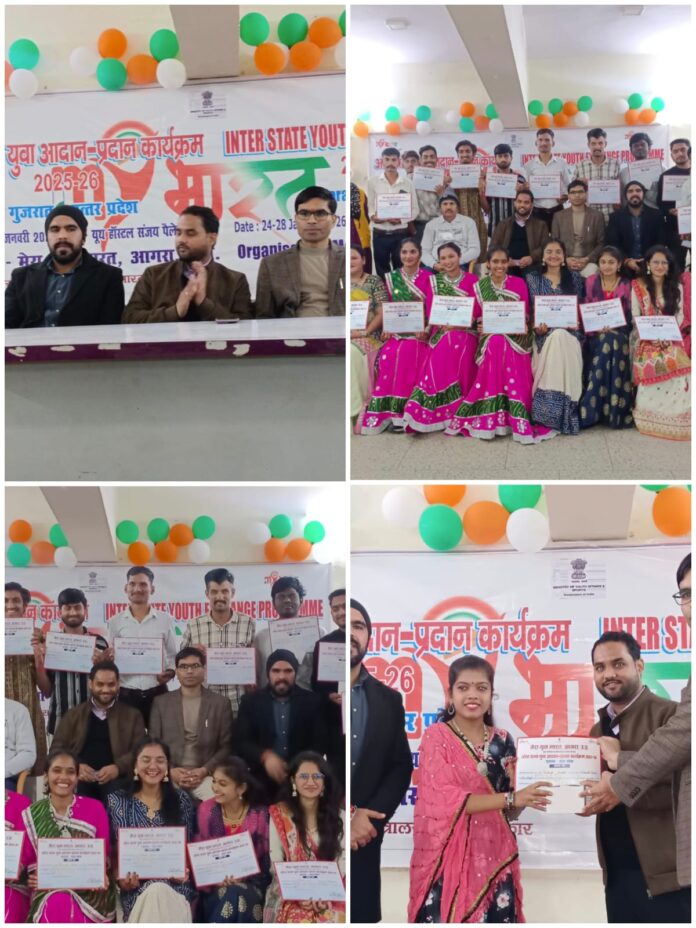 आगरा, (राष्ट्र की परम्परा)l युवाओं को राष्ट्रीय एकता, सांस्कृतिक समरसता और नेतृत्व क्षमता से जोड़ने की दिशा में एक महत्वपूर्ण पहल के रूप में इंटरस्टेट यूथ एक्सचेंज प्रोग्राम 2026 का सफल समापन मंगलवार को यूथ होस्टल, संजय पैलेस, आगरा में किया गया। यह कार्यक्रम मेरा युवा भारत, आगरा द्वारा युवा कार्यक्रम एवं खेल मंत्रालय, भारत सरकार के मार्गदर्शन में आयोजित किया गया, जिसमें गुजरात राज्य से आए युवाओं ने सक्रिय सहभागिता की।