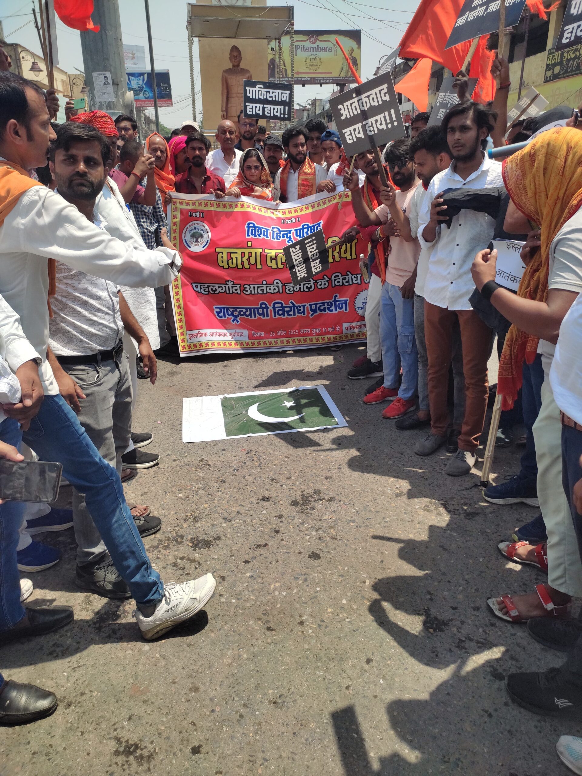 शुक्रवार को विश्व हिंदू परिषद बजरंग दल देवरिया द्वारा जम्मू कश्मीर के पहलगाम में मंगलवार को हुई भीषण आतंकी घटना के विरोध में, धरना प्रदर्शन व पुतला दहन किया गया।