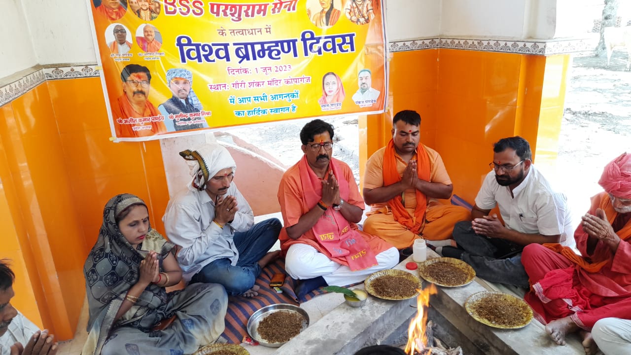 नगर पंचायत क्षेत्र के प्राचीन गौरीशंकर मंदिर पर बृहस्पतिवार की सुबह बी एस एस परशुराम सेना के तत्वध्यान में विश्व ब्राह्मण दिवस के अवसर पर बुद्धि शुध्दि और विश्व कल्याण हेतु हवन का आयोजन किया गया। इस कार्यक्रम में महिला प्रकोष्ठ की जिलाध्यक्ष ममता पाण्डेय को दुर्गा वाहिनी के रूप में ब्राह्मण शिरोमणि गोपाल तिवारी द्वारा माँ दुर्गा की तस्बीर और अंगवस्त्र देकर सम्मानित किया किया गया।