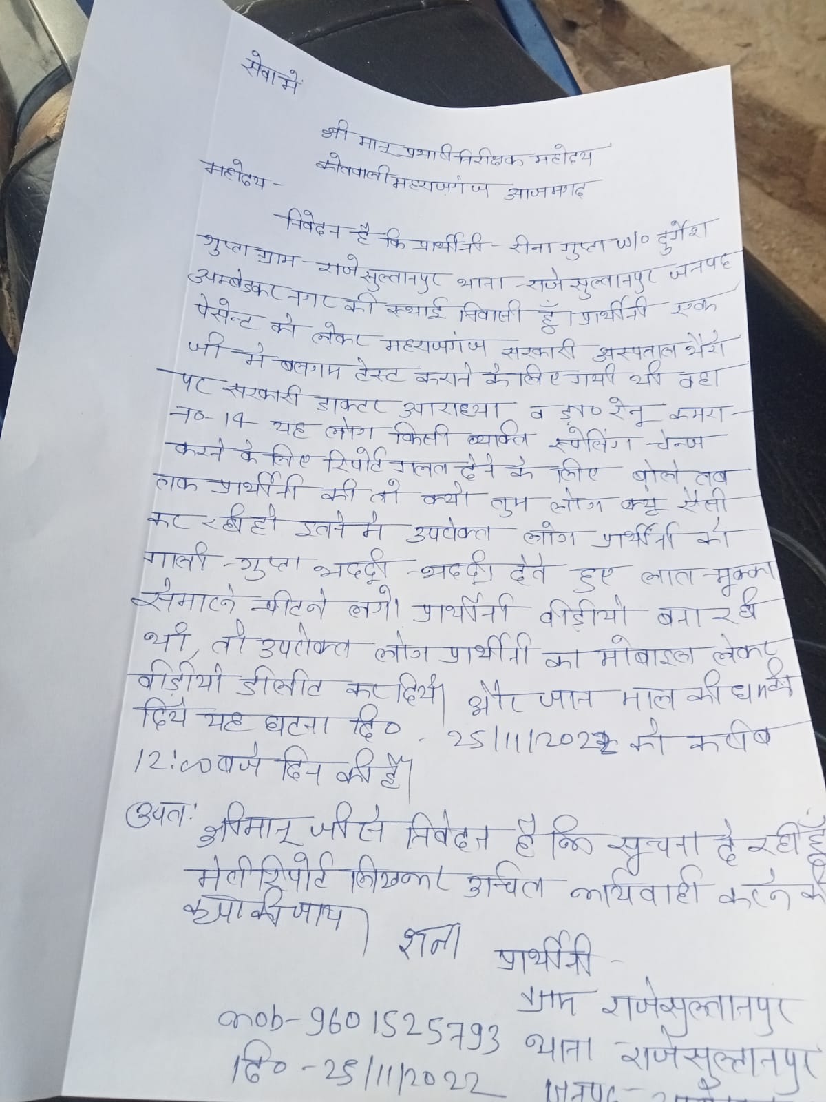 यह मामला आजमगढ़ जिला के महाराजगंज कोतवाली क्षेत्र के बाजार में स्थित सरकारी अस्पताल की घटना है, जिसको लेकर पीड़ित महिला पत्रकार ने अपने अन्य पत्रकार साथियों के साथ लिखित प्रार्थना पत्र देकर महाराजगंज पुलिस से न्याय की गुहार लगाई है। पुलिस ने पत्रकारों को इंसाफ दिलाने का भरोसा दिया हैं।