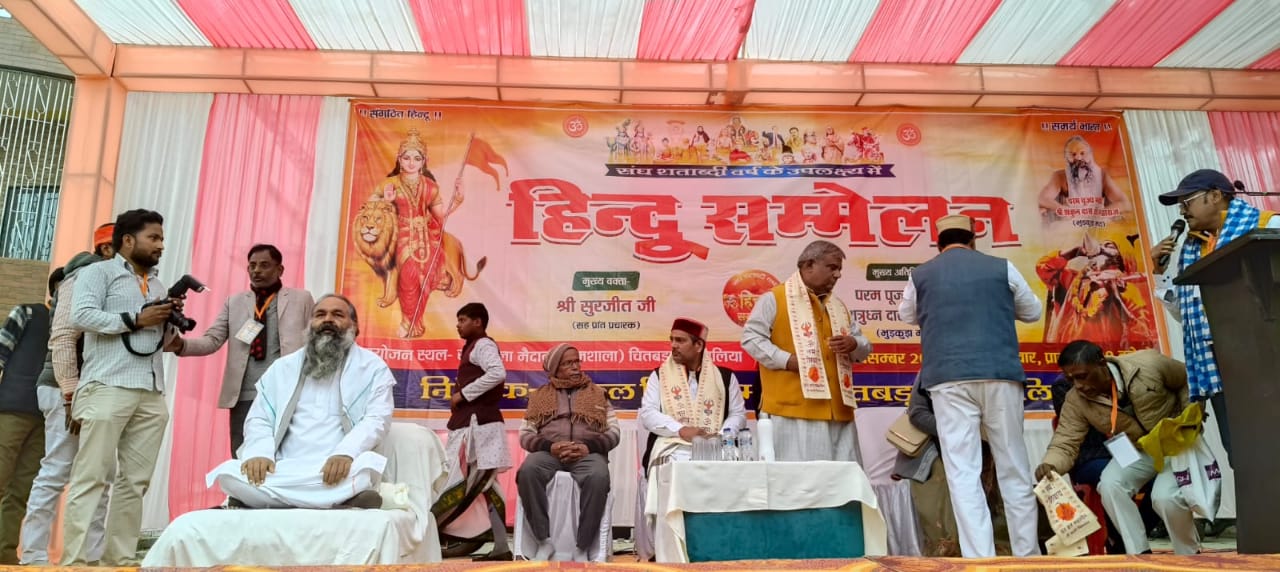 चितबड़ागांव कस्बा अंतर्गत धर्मशाला परिसर में हिंदू समाज की ओर से एक भव्य हिंदू सम्मेलन का आयोजन किया गया। सम्मेलन का उद्देश्य समाज को संगठित कर कार्यक्रम को सफल बनाना रहा। कार्यक्रम की शुरुआत मां सरस्वती के चित्र पर दीप प्रज्वलन के साथ की गई, जिससे वातावरण भक्तिमय हो उठा। सम्मेलन को सफल बनाने में लोक कलाकार गोपाल राय और हरि हलचल की महत्वपूर्ण भूमिका रही। दोनों कलाकारों ने अपने ओजपूर्ण और भावनात्मक गीतों के माध्यम से श्रोताओं को मंत्रमुग्ध कर दिया। गीतों की प्रस्तुति से पूरा परिसर हिंदुत्वमय वातावरण में डूब गया और उपस्थित जनसमूह ने उत्साहपूर्वक कार्यक्रम का आनंद लिया। कार्यक्रम के मुख्य वक्ता एवं प्रांत प्रचारक सुरजीत जी ने अपने संबोधन में कहा कि हिंदुत्व की वास्तविक आधारशिला एकता, अखंडता और पारस्परिक संबंधों में निहित है। उन्होंने कहा कि मानवता का समावेशन ही हिंदुत्व का मूल तत्व है और समाज को इसी भावना के साथ आगे बढ़ना चाहिए। कार्यक्रम के मुख्य अतिथि सूफी संत परंपरा के सिद्धपीठ भुड़कुड़ा मठ के महंत शत्रुघ्न दास जी महाराज ने अपने उद्बोधन में हिंदुत्व को एकता के सूत्र में पिरोने पर बल दिया। उन्होंने कहा कि आपसी सद्भाव और समरसता से ही समाज मजबूत बनता है। इस अवसर पर अमरजीत सिंह, शशिकला तिवारी, पूनम उपाध्याय सहित हजारों की संख्या में लोग उपस्थित रहे। कार्यक्रम की अध्यक्षता डॉक्टर धर्मात्मानंद गुप्ता ने की, जबकि संचालन अंजनी कुमार उपाध्याय ने किया। सम्मेलन शांतिपूर्ण एवं सफलतापूर्वक संपन्न हुआ।