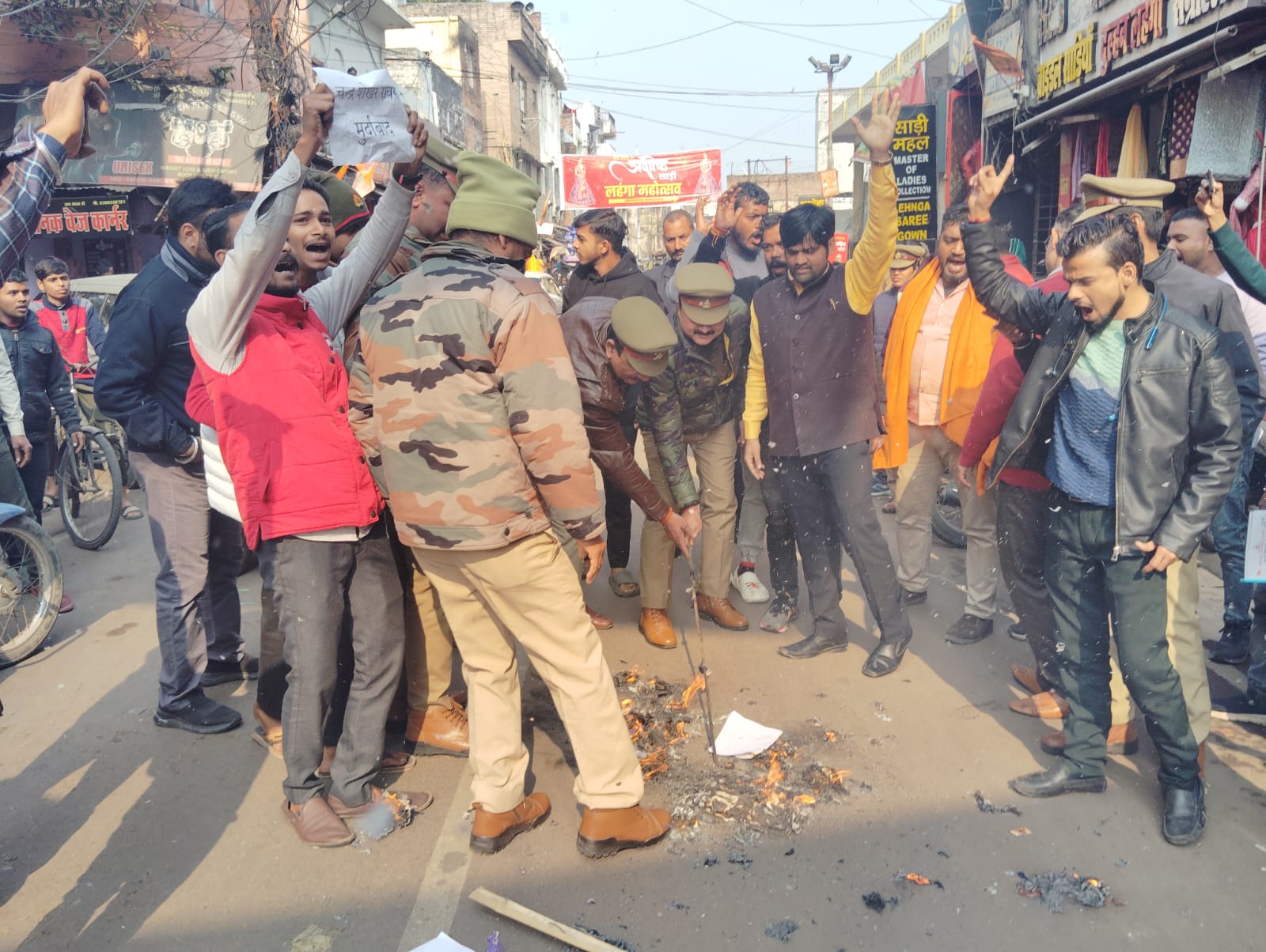 लखनऊ (राष्ट्र की परम्परा)। नगीना से सांसद चंद्रशेखर आजाद रावण के द्वारा पूर्व में दिए गए विवादित बयान पर आक्रोशित होकर हिंदू समाज पार्टी ने आज लखनऊ में उनका पुतला फूंक कर अपना गहरा रोष प्रकट किया ! प्रयागराज में शुरू हो रहे हिंदुओं के आस्था का महापर्व महाकुंभ को लेकर सांसद चंद्रशेखर आजाद ने पूर्व में कहा था कि ,कुंभ में वही लोग जाए जिन्होंने पाप किया है ! हिंदू समाज पार्टी के कार्यकारी प्रदेश अध्यक्ष गौरव गोस्वामी के नेतृत्व में कार्यकर्ताओं ने सांसद चंद्रशेखर आजाद रावण के खिलाफ मुर्दाबाद के नारे लगाते हुए अमीनाबाद रोड खुरशेद बाग गेट पर रावण का पुतला फूंक कर आक्रोश जताते हुए कार्यकारी प्रदेश अध्यक्ष गौरव गोस्वामी ने नाका पुलिस के माध्यम से हजरतगंज इन्स्पेक्टर को सांसद चंद्रशेखर आजाद के खिलाफ एफआईआर दर्ज कर उन पर रासुका लगाने की मांग करते हुए तहरीर दी गयी।