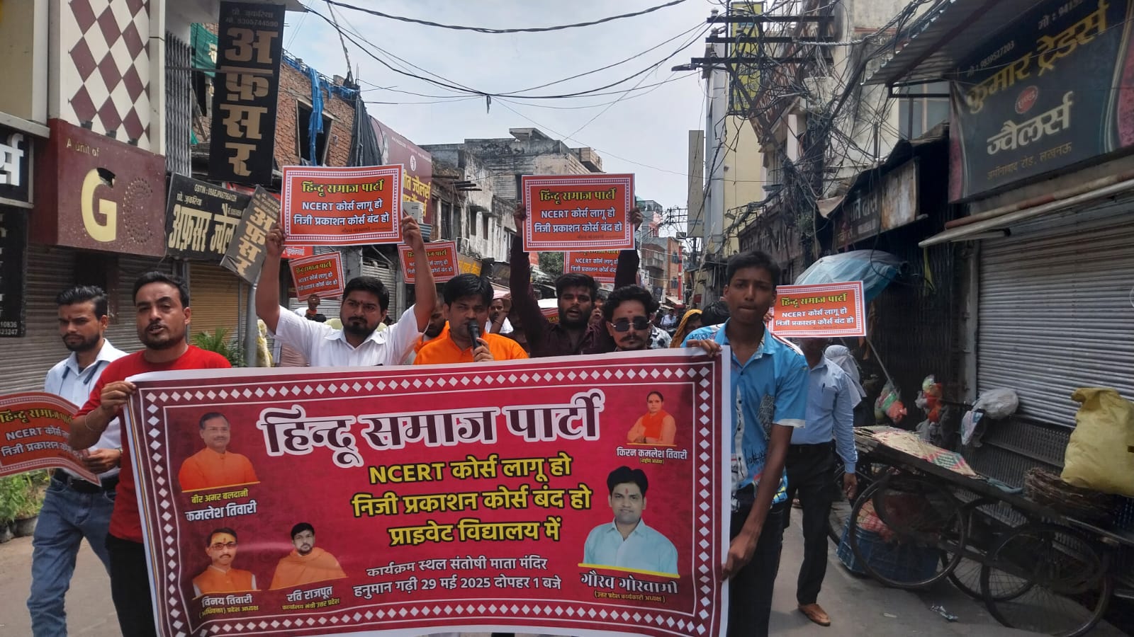 लखनऊ (राष्ट्र की परम्परा)। लखनऊ में हिंदू समाज पार्टी ने गुरुवार को शिक्षा माफियाओ के खिलाफ आंदोलन छेड़ा और मांग की जितने भी प्राइवेट स्कूल उत्तर प्रदेश में है उन सभी में निजी प्रशासन को हटाकर एनसीईआरटी कोर्स लागू किया जाए । उक्त विरोध प्रदर्शन का नेतृत्व हिंदू समाज पार्टी उत्तर प्रदेश कार्यकारी के अध्यक्ष गौरव गोस्वामी ने किया और पार्टी के अनेको कार्यकर्ता मौजूद रहे।