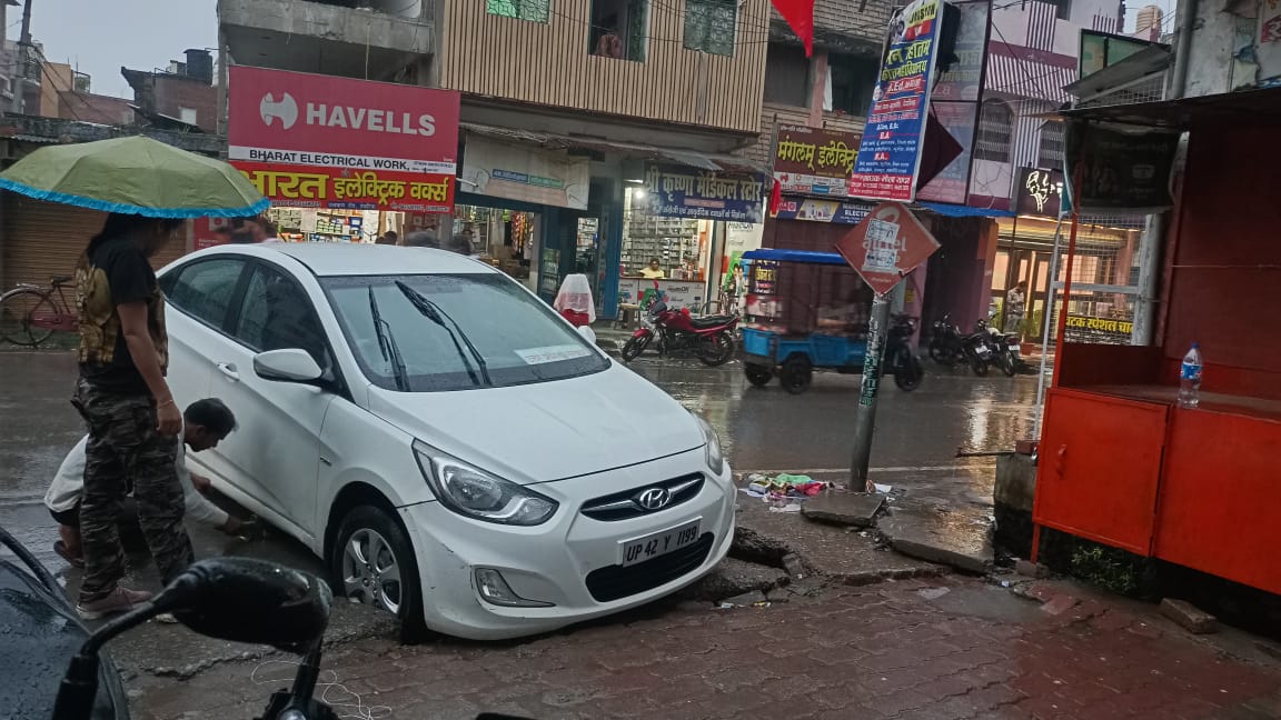 रविवार को हो रही बारिश में एक वीआईपी गाड़ी जिस पर उत्तर प्रदेश सरकार लिखा हुआ थाl स्लैब व निकले सरिये के वजह से नाले में फंस गईl कार अगले दोनो पहियों का टायर फट गयाl