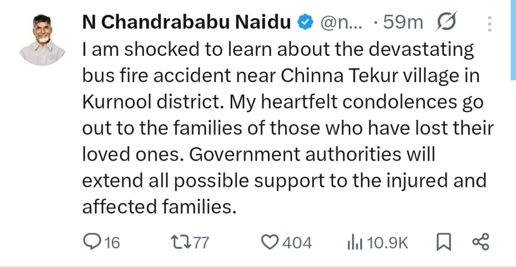 “कुरनूल जिले में हुई बस दुर्घटना के बारे में जानकर गहरा दुख हुआ। मेरी संवेदनाएं उन परिवारों के साथ हैं जिन्होंने अपने प्रियजनों को खोया है। प्रशासन को निर्देश दिया गया है कि सभी घायलों को हरसंभव मदद दी जाए।”