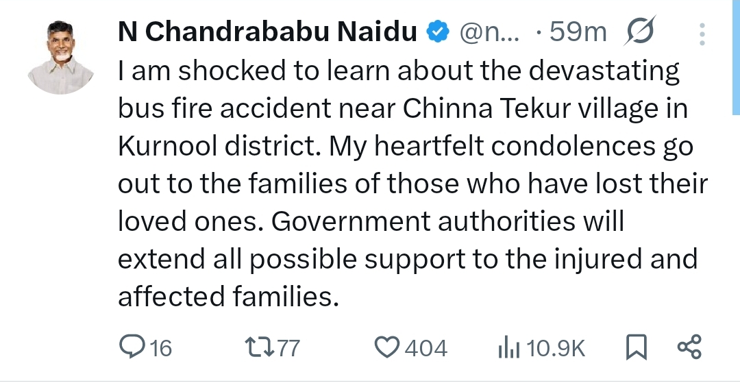 “कुरनूल जिले में हुई बस दुर्घटना के बारे में जानकर गहरा दुख हुआ। मेरी संवेदनाएं उन परिवारों के साथ हैं जिन्होंने अपने प्रियजनों को खोया है। प्रशासन को निर्देश दिया गया है कि सभी घायलों को हरसंभव मदद दी जाए।”