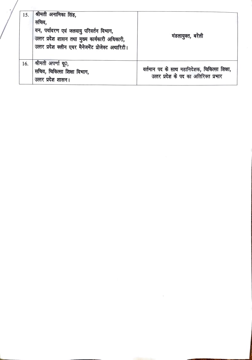 तबादलों की सूची इस प्रकार है: रंजन गुप्ता – प्रमुख सचिव खाद्य सुरक्षा पद से हटाए गए। सुहास एल.वाई. – महानिदेशक युवा कल्याण एवं प्रवर्तन रक्षक दल का अतिरिक्त चार्ज। चैत्रा वी. – महानिदेशक आयुष। संजय कुमार खत्री – प्रभारी सीईओ बुंदेलखंड औद्योगिक विकास प्राधिकरण। कंचन वर्मा – आयुक्त एवं सचिव राजस्व परिषद।मोनिका रानी – प्रभारी महानिदेशक स्कूल शिक्षा। विजय विश्वास पंत – मंडलायुक्त लखनऊ। रोशन जैकब – सचिव खाद्य सुरक्षा एवं औषधि प्रशासन। राजेश कुमार द्वितीय – महानिदेशक पर्यटन। सौम्या अग्रवाल – मंडलायुक्त प्रयागराज। किंजल सिंह – परिवहन आयुक्त उत्तर प्रदेश। बृजेश नारायण – सचिव सामान्य प्रशासन विभाग। मनीषा त्रिघाटिया – सचिव महिला कल्याण एवं बाल विकास पुष्टाहार। बी. चंद्रकला – सचिव वन एवं पर्यावरण तथा जलवायु परिवर्तन।अनामिका सिंह – कमिश्नर बरेली। अपर्णा यू. – महानिदेशक चिकित्सा शिक्षा उत्तर प्रदेश का अतिरिक्त चार्ज।