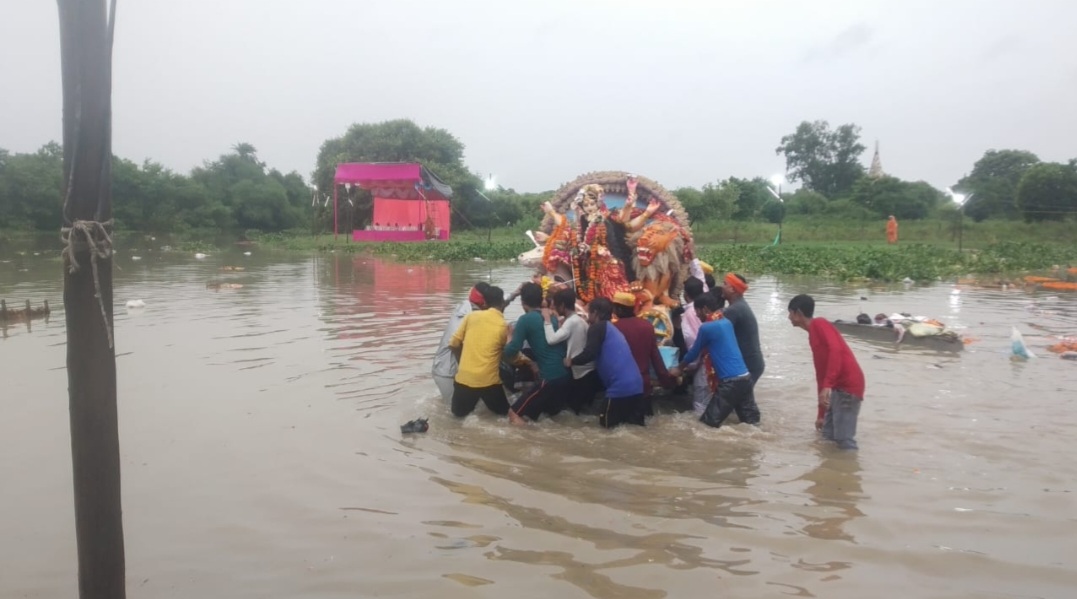 बहराइच (राष्ट्र की परम्परा)नगर के साथ साथ ग्रामीणों क्षेत्रों में माँ दुर्गा की पूजा अर्चना कर विसर्जित किया गया जनपद बहराइच में भारी बारिश के बीच सकुशल सम्पन हुआ श्री माँ दुर्गा प्रतिमाओं का विसर्जन झिंगहाघाट सरयू नदी तट पर विसर्जन दो दिन से हो रही मूसलाधार बारिश के चलते सरयू नदी का जल स्तर बढ़ा देख जिला प्रशासन व दुर्गा पूजा महा समिति ने गाइड लाइन जारी कर दिन ही दिन मूर्ति विसर्जित कराने का फैसला किया दुर्गा पूजा समितियों ने सुबह से ही मूर्तियों का विसर्जन करना शुरू कर दिया दुर्गा पूजा महासमिति के पदाधिकारी चप्पे-चप्पे पर तैनात व पुलिसकर्मियों के साथ साथ आलाधिकारियों ने जगह जगह सुरक्षा के मद्देनजर पीएससी के जवान हर जगह तैनात किए गए नगर मूर्ति में महिलाओं का उत्साह देखने लायक था झूमते नाचते महिलाओं ने माता रानी के जयकारे लगाते हुए झिंगाघट के तट पर सभी श्रद्धालुओं ने माँ दुर्गा को नम आंखों से विदा किया खबर लिखे जाने तक विसर्जन चल रहा है